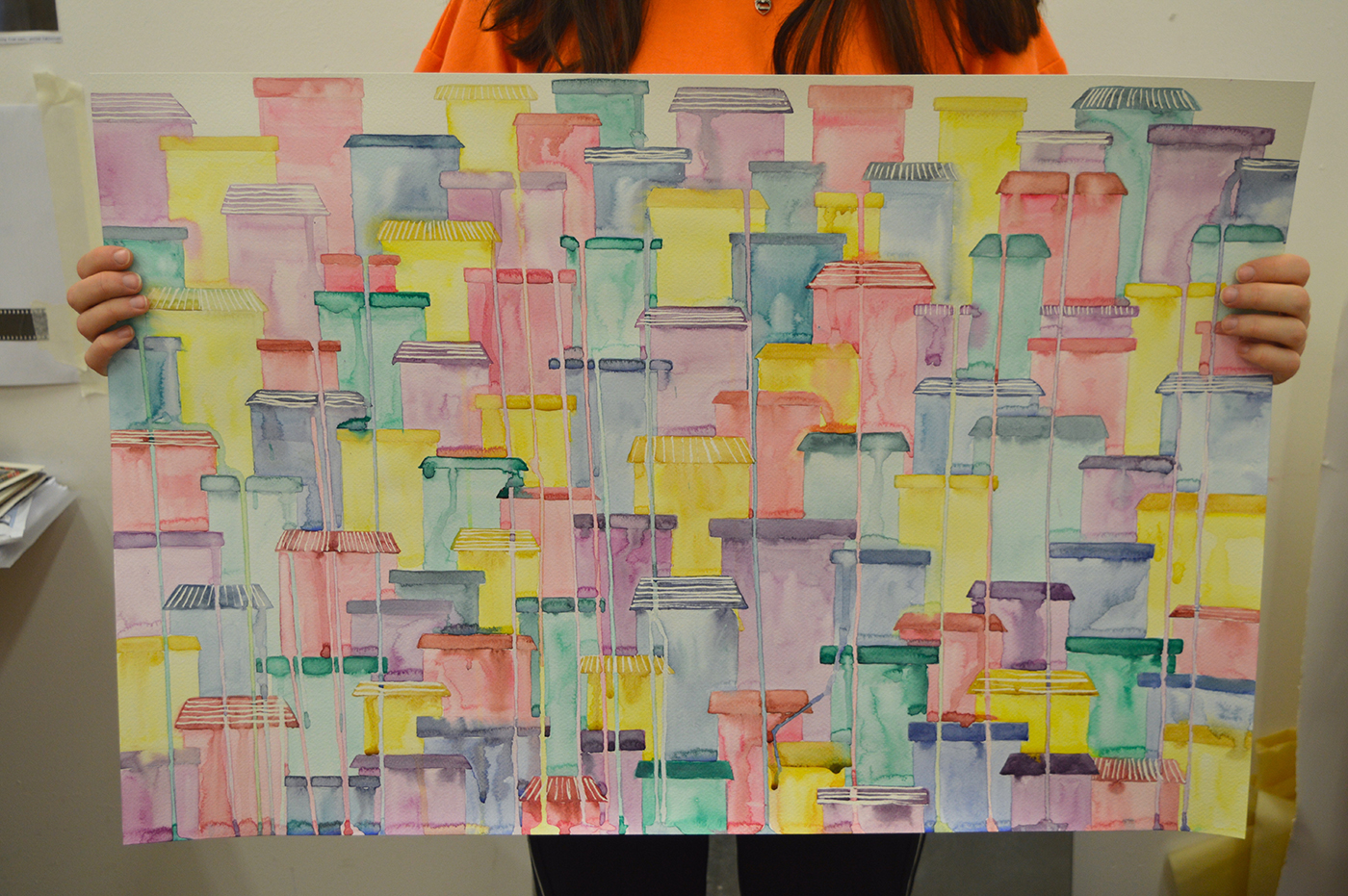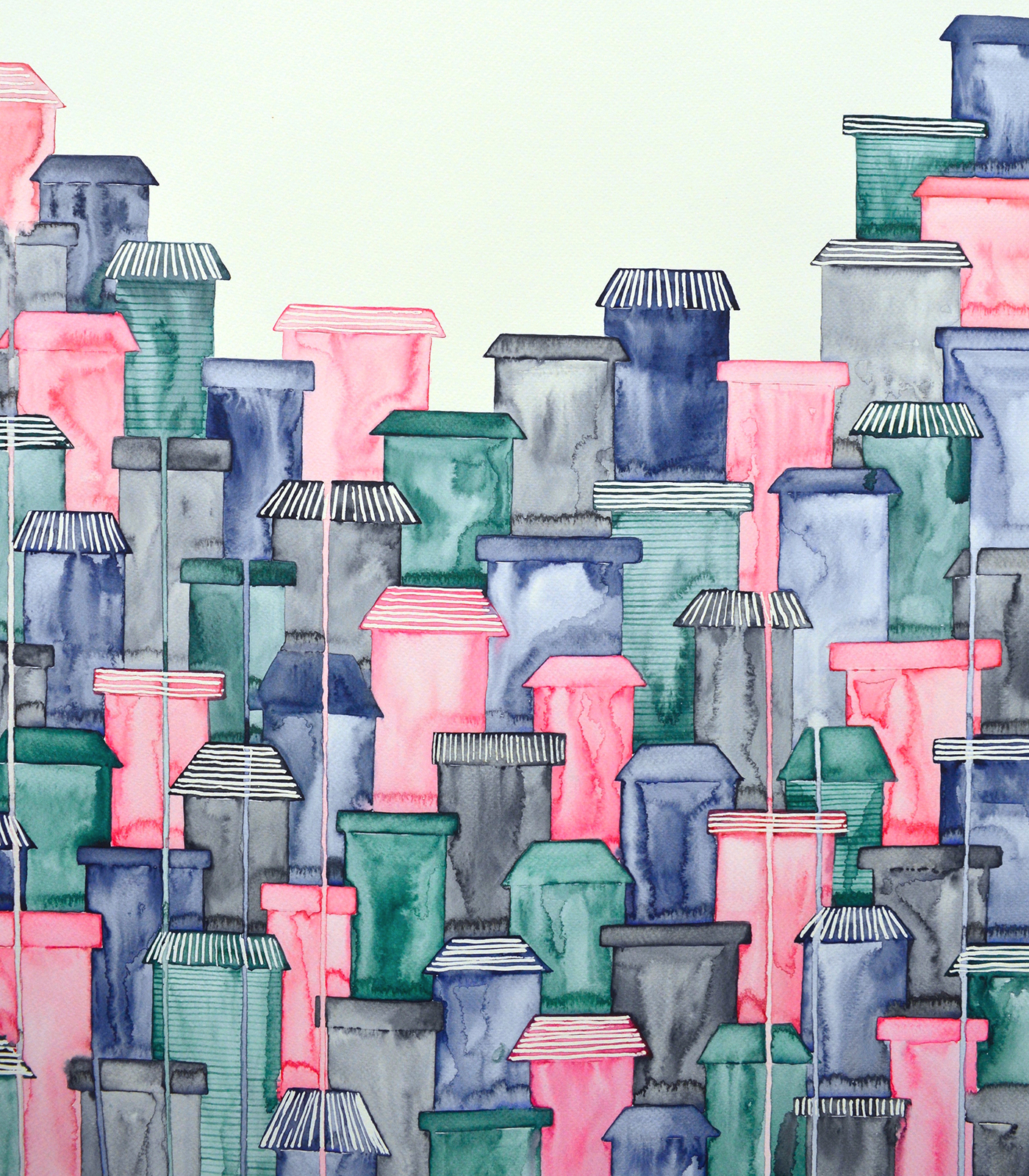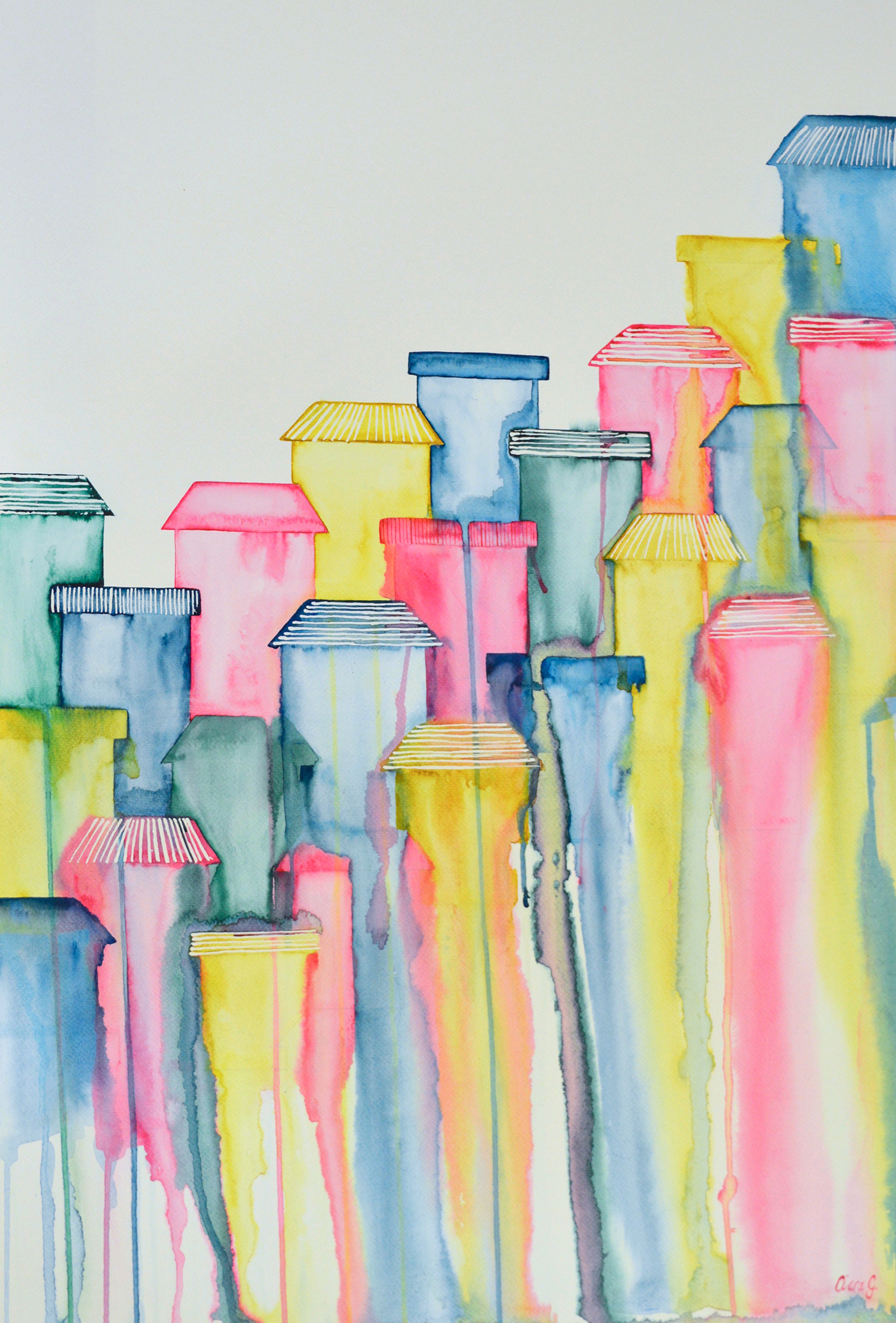 I make watercolour paintings of simple architectural forms which drip, bleed, blur and blend together to create a two-dimensional colourful chaos. I am fascinated by the historical relationship between watercolour and architecture, which involved depicting building materials such as tiles, as well as the more current relationship reformed by architectural drawings and sketches. By using architectural forms as motif, my work explores the tensions between pattern and structure, and, order and disorder.