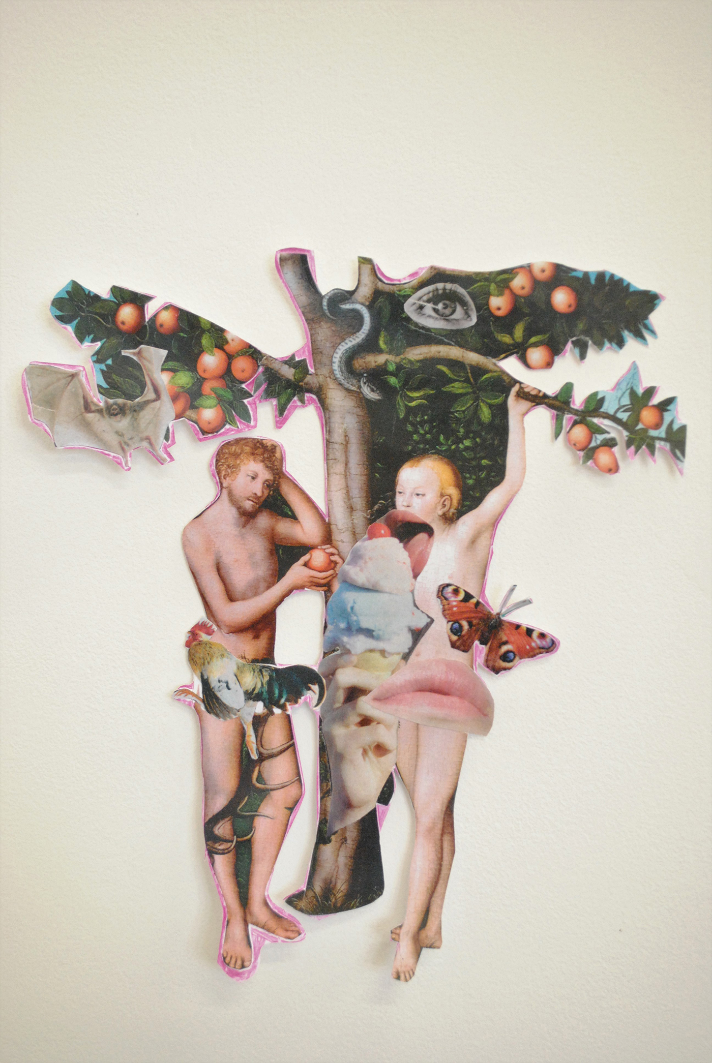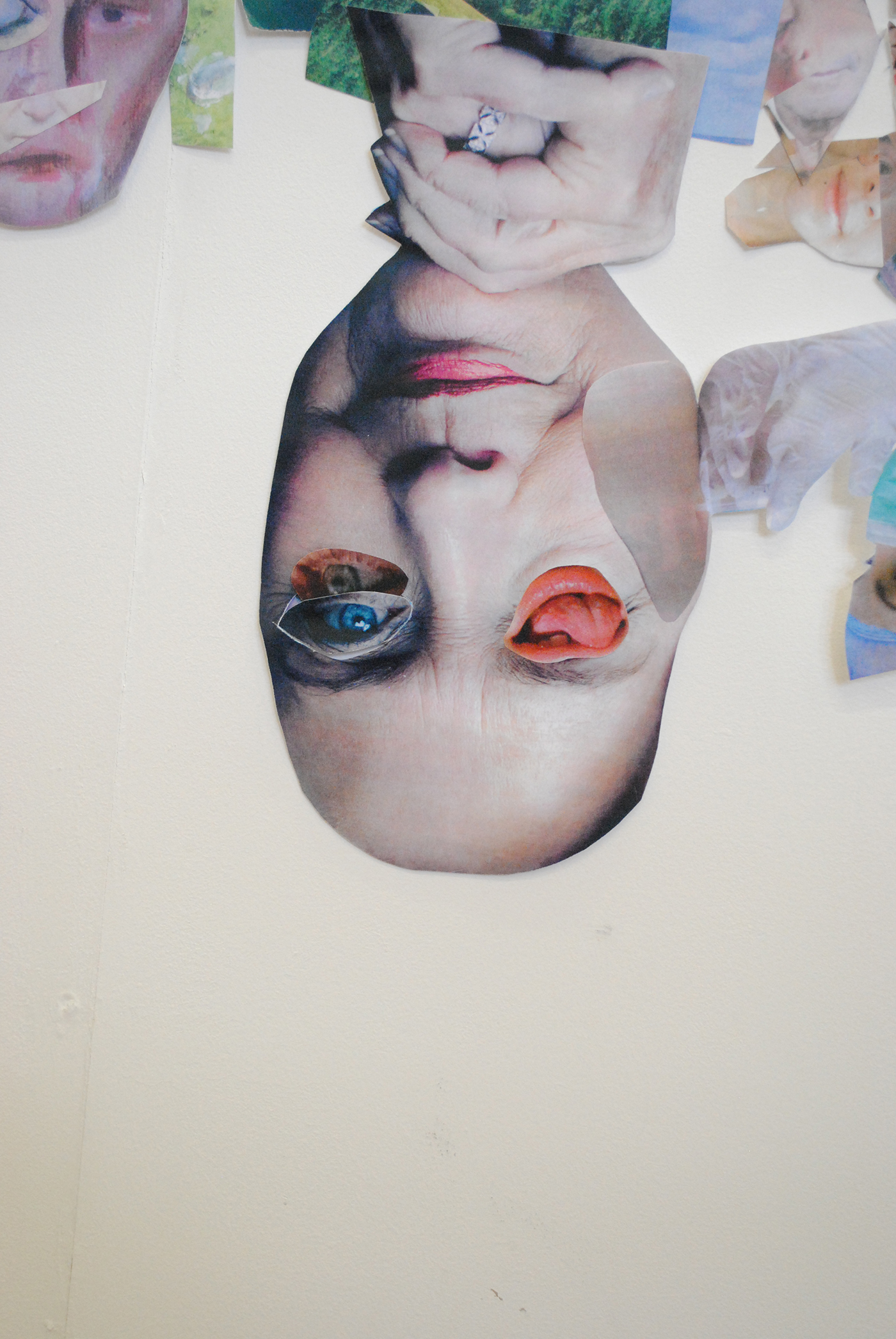 ‘Media Dreaming’ is a body of work that looks at the overload and throw away culture of media. By using collage, a chaotic dreamlike scene is created to imagine how an overload of information received from media sources are processed. The material used is a mash-up of paintings and found imagery which is then photocopied to give a sense of a trivial sameness. The images come together as the familiar and unfamiliar to produce a collection of absurd scenes, while other images become so fragmented they are almost unrecognisable. The collage is directly pasted to the wall allowing the lifespan of the work to last only for the duration of the exhibition, it becomes obsolete along with the media used to produce it.