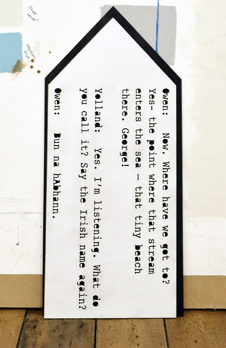 Thart Timpeall Orainn, is a film piece, accompanied by external sculpture works, that explores the bilingual landscape that is the public space in Ireland. The work will have both spoken Irish and English. The work aims to explore the viewer’s understanding of the Irish language. To bring attention to the co-existence of Irish and English in our society whether the viewer has a positive, negative or no opinion on the language, whether they are fluent or only have the “cúpla focal”. This work can be experienced differently depending on whether the viewer is fluent or has the “cúpla focal”. It aims to bring attention to how the language is integrated in everyday society, on public transport, on public buildings, road and traffic signs.