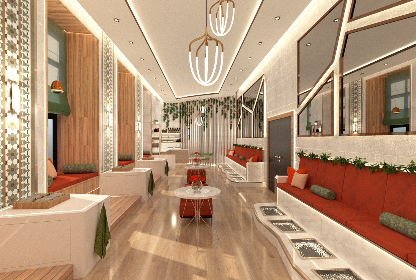 Edenderry Wellness Centre was created as a relaxing haven in Belfast City for those who wish to escape stressful city life. The project entailed the conversion of an existing mill building for use as a wellness centre. The location and culture of the surrounding area and the topic of the building’s new use was researched, creating a concept focused on yoga positioning and bringing the feeling of nature into the city for visitors to ‘get away.’ A base of woods and neutral colours with shades of green and orange were applied to instil this ambiance memorably. The centre includes a spa, a pool, treatment, massage and guest rooms, a facial bar, pedicure suites, workshop studios, and a rooftop lounge featuring an alcohol-free juice bar and buffet bar.