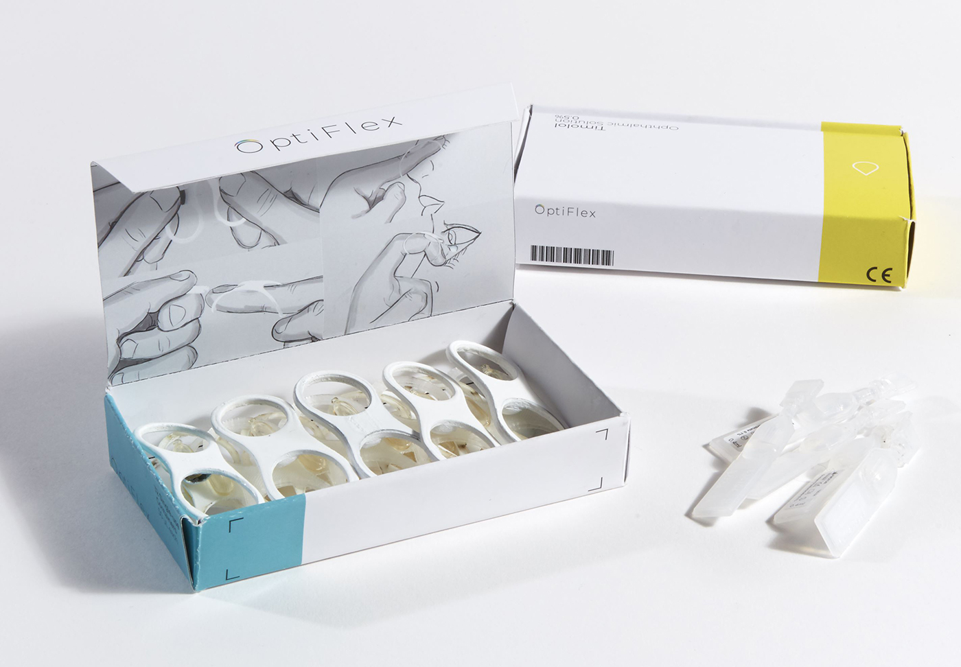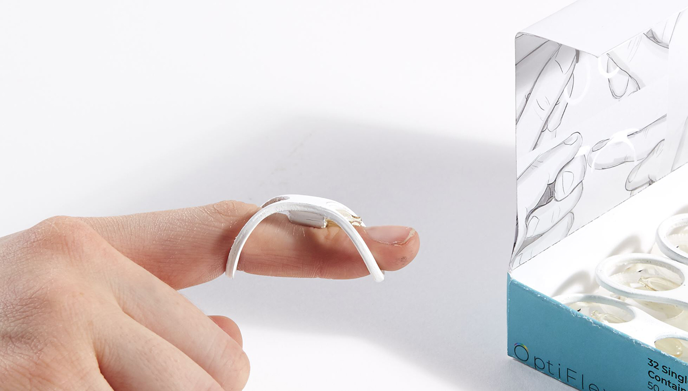OptiFlex is a device that aims to reduce non-adherence rates among people suffering from glaucoma. Common eye drops rely on the physical capabilities of the user to be instilled correctly. Due to limited dexterity and vision loss glaucoma sufferers, who are typically an older demographic, can find it difficult to align their bodies into the necessary position to receive drops. This can affect their rate success and adherence to the prescription. OptiFlex addresses these issues by simplifying the movements required to administer medication into the eye. Through a novel delivery system worn on the user’s finger, drops can be applied to the eye through the simple motion of flexing a finger. OptiFlex is disposable, patients will now be prescribed a set of thirty-two single use OptiFlex devices to coincide with their prescriptions with multiple sets given if prescriptions require more drops.