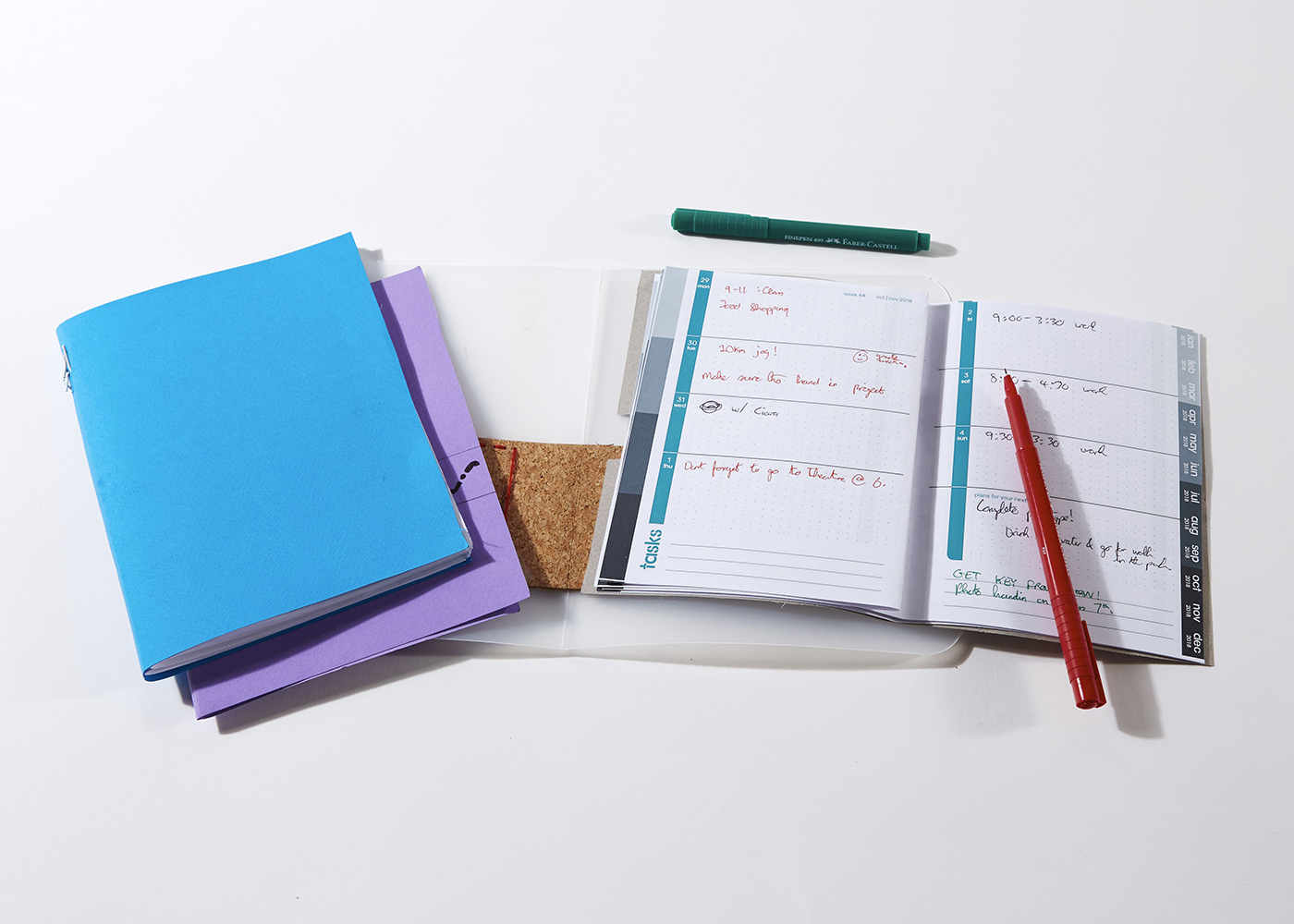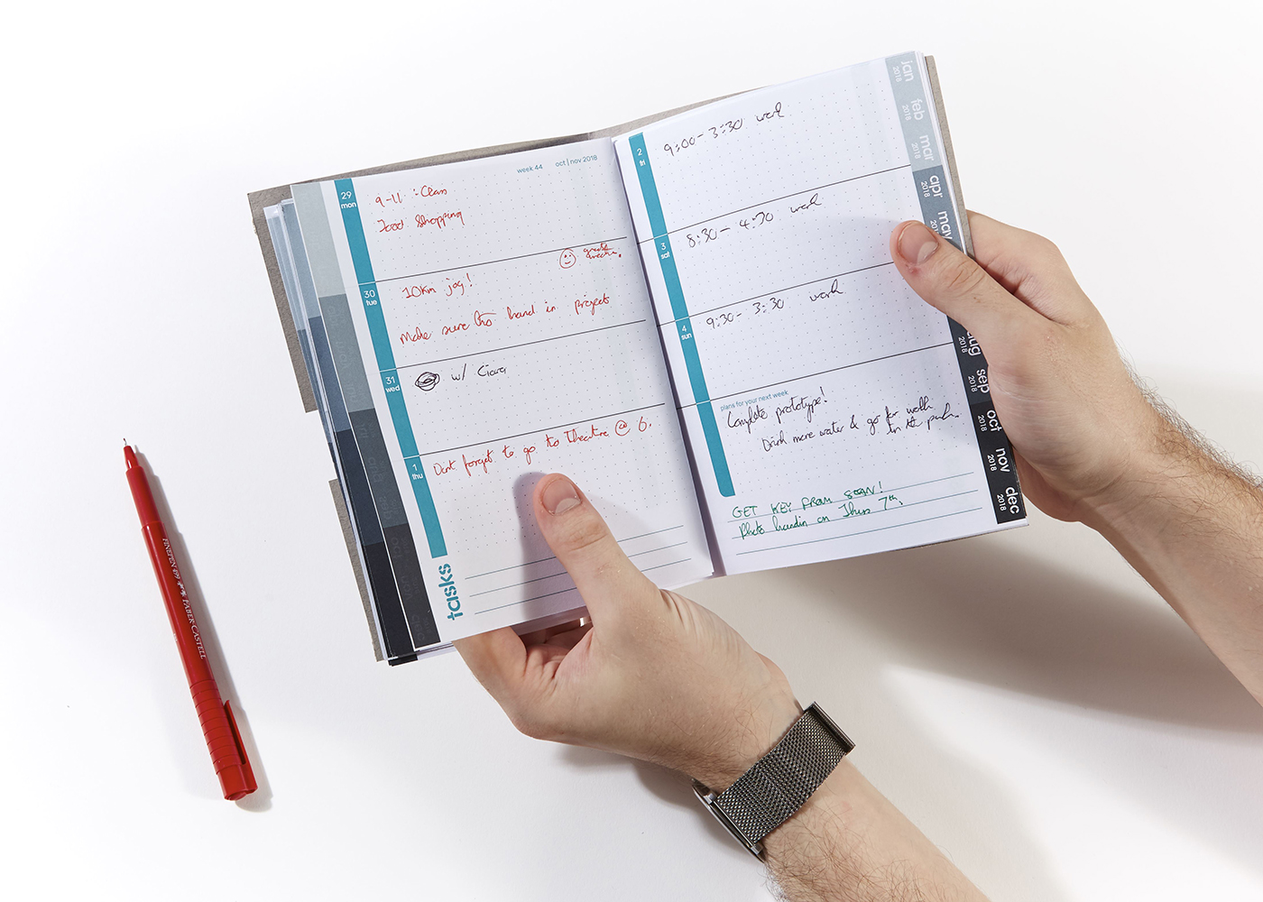 Ornj is a paper-based modular journal that helps keep creatives organised and connected to their thoughts in a more meaningful way. Detachable booklets magnetically snap together and can be used in different configurations. When a booklet is finished, it can be scanned and the contents are assigned metadata so thoughts are never lost. Ornj was conceived in response to the noise creatives experience when working with digital organisers. Thoughts kept on paper often got lost or damaged over time. Ornj attempts to emphasise the value of physical writing in the design process. Pages contain a title, date, and category marker which can be scanned and read by the accompanying application through existing scanned images on the desktop application. Scans are automatically named and organised in a folder structure, so users can find the information they need through a simple search. The physical copies can be kept to build a physical legacy of work over the years.