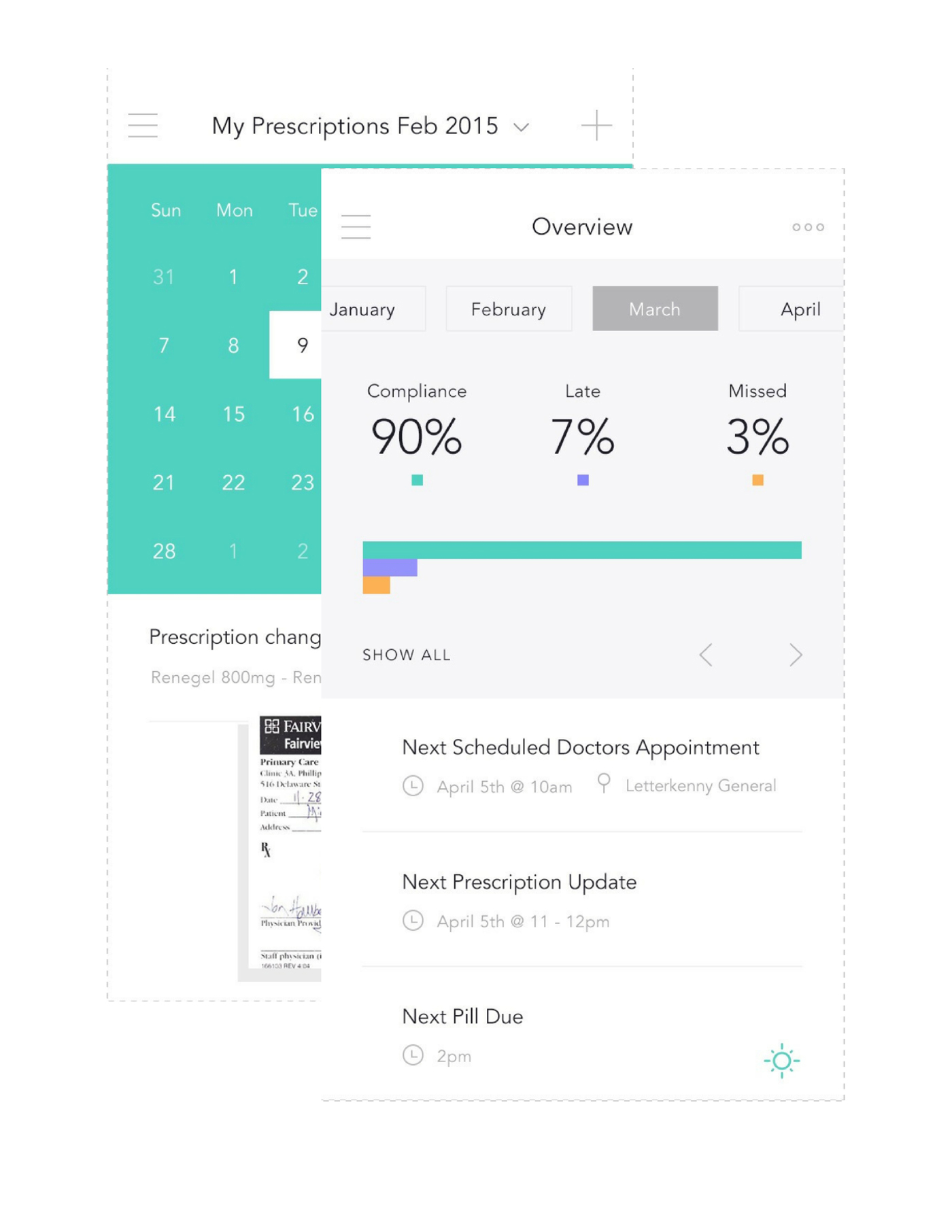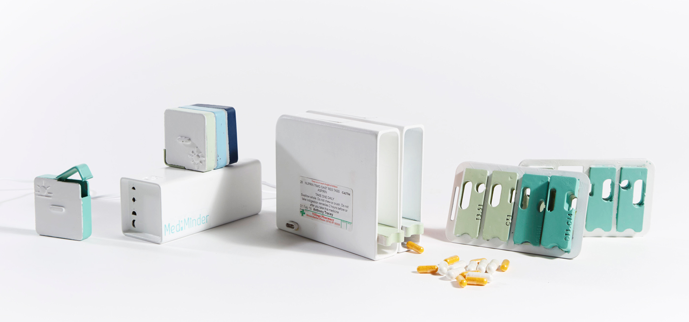 MediMinder is a smart medication management system for the home and a tool to enable patients to adhere to prescribed prescriptions as directed. It targets patients aged 18–60, giving them an alternative to the stigmatised monitored dosage systems currently supplied by pharmacies. MediMinder consists of a smart pill dispenser that is filled by a pharmacist and then programmed by the user via the system's app to conform to their individual regime. Containers illuminate when it’s time to take pills, guiding users to take the correct pill and the correct dosage. The app is designed to help monitor and remind users to take their medication while also providing a clear stream of communication with health care professionals by tracking a patient’s compliance, list of medication as well as a history of prescriptions etc. The ‘To-go’ feature allows one to take their medication subtly on the go, without raising questions from others. This user-friendly system is designed to take the frustration out of this common everyday problem and improve a user’s compliance and overall wellbeing.