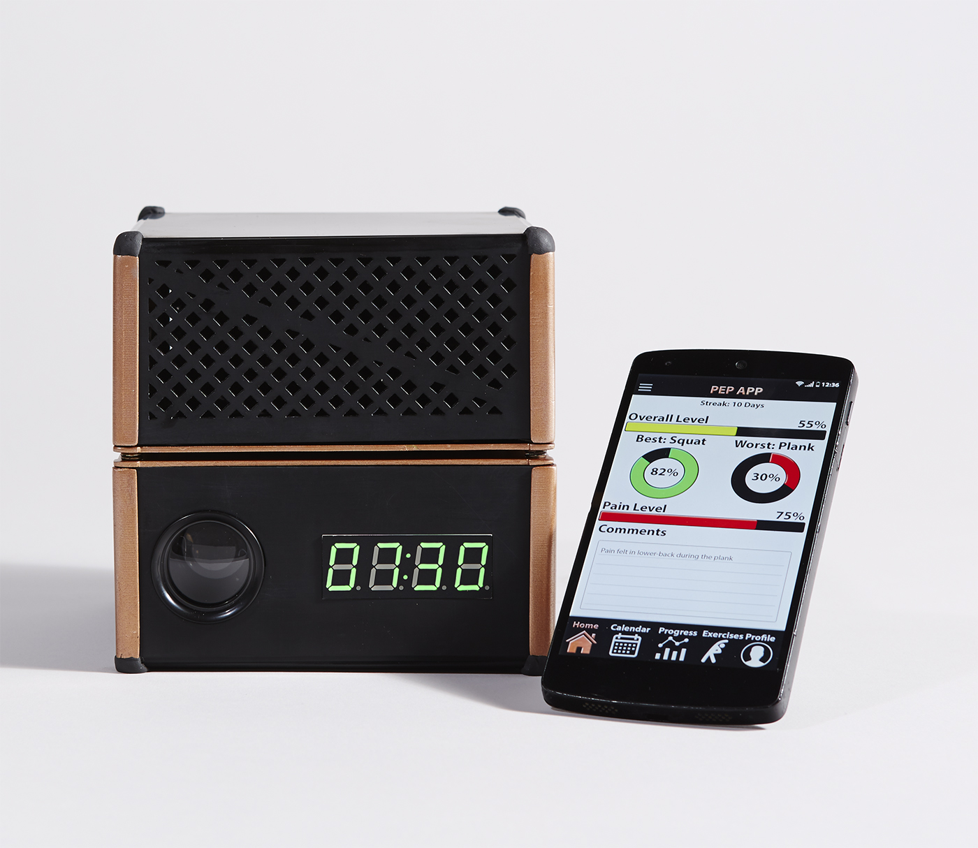 The aim of ‘PEP’ is to remove the decision-making process from the user leading up to performing their exercises, which is often the main barrier to adherence. This is achieved with the use of projections of instructional exercise videos, activating as an alarm at a pre-decided time. This automatically reminds the user to begin their exercise routine at the same time daily, eventually leading the activity to become a habit. Motion capture technology then measures the users exercise form through skeleton tracking. Through the connected application, this motion capture information is then evaluated against desired exercise form for each exercise and user progression is recorded. Progression and proof of exercise effectiveness in alleviating pain is one of the most powerful forms of motivation and drives the user to continue interaction with ‘PEP’. The application also acts as a constant connection method between the user and their medical practitioner/physiotherapist ensuring users don’t outgrow their exercise programmes.