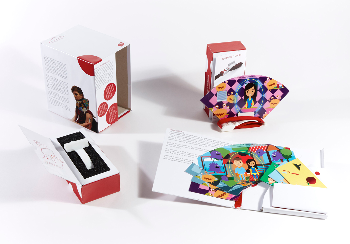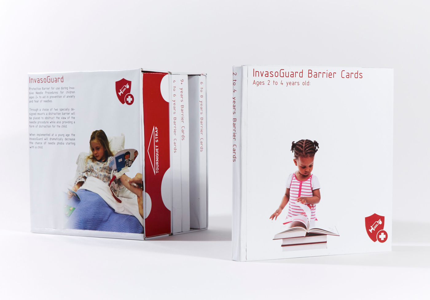The InvasoGuard Kit contains a booklet of “Barrier Cards”. These uniquely shaped paper cutouts are designed to block the sight of the needle. It is placed in a specially designed tourniquet or shoulder mount which is applied to the child’s arm. These “Barrier Cards” are the first step of interaction with the child. The health care professional will show the cards to the child and the child picks out their chosen card. The card’s contents will differ depending on the age of the child. For younger children, the cards will be primarily colourful and picture based with limited information and as the age increases of the child, the content will become more detailed and the distraction will be through games and learning exercises.