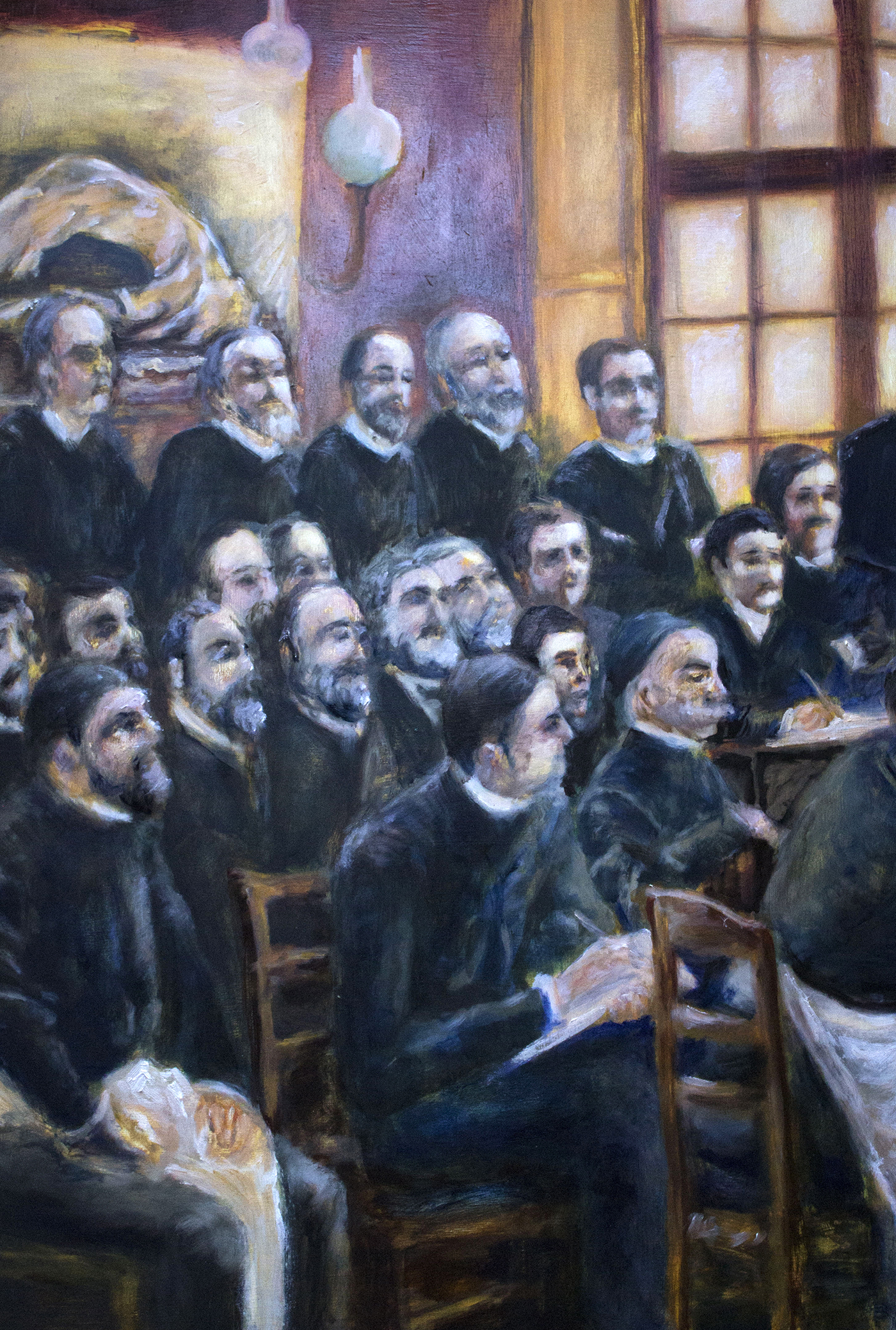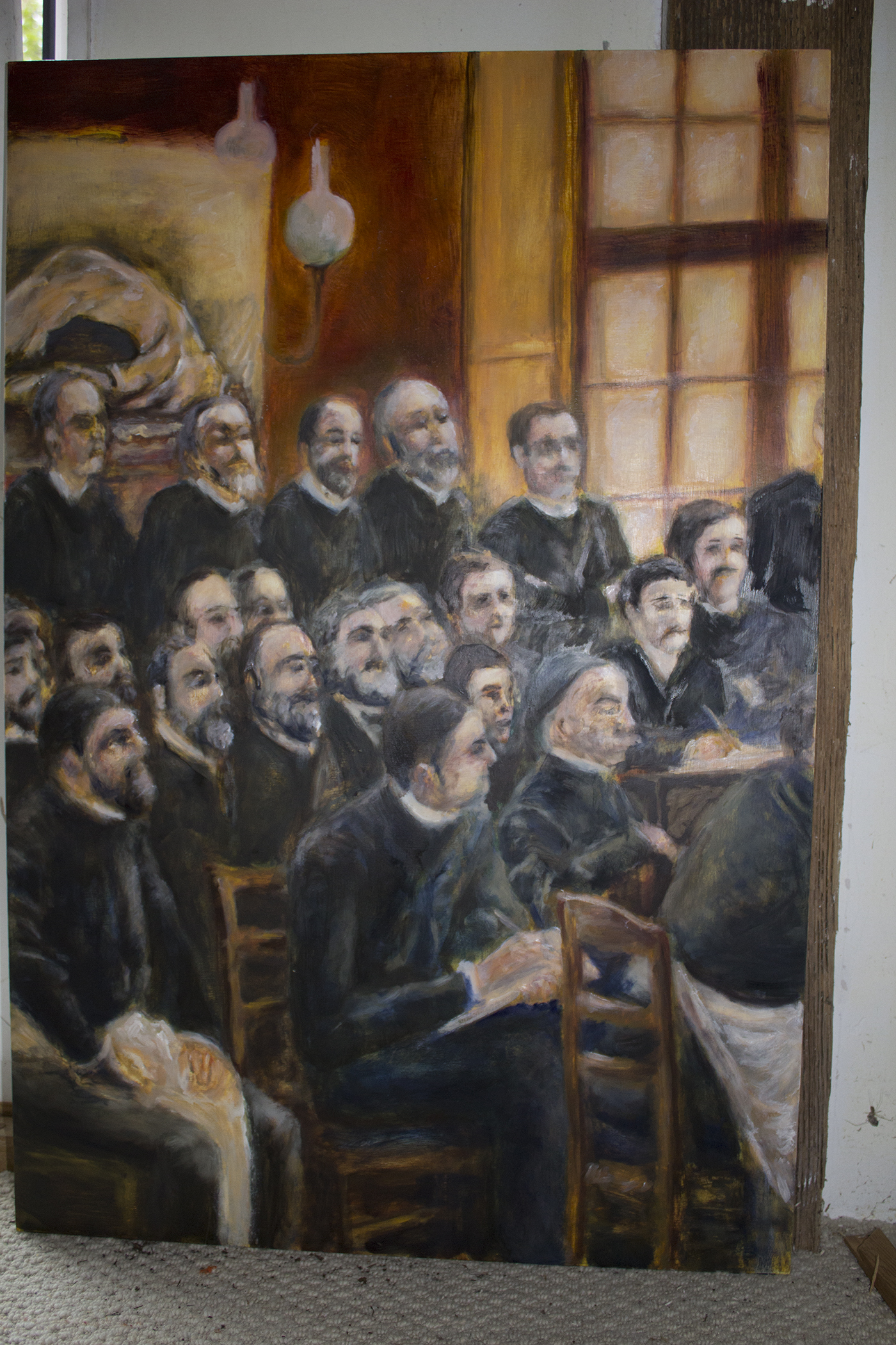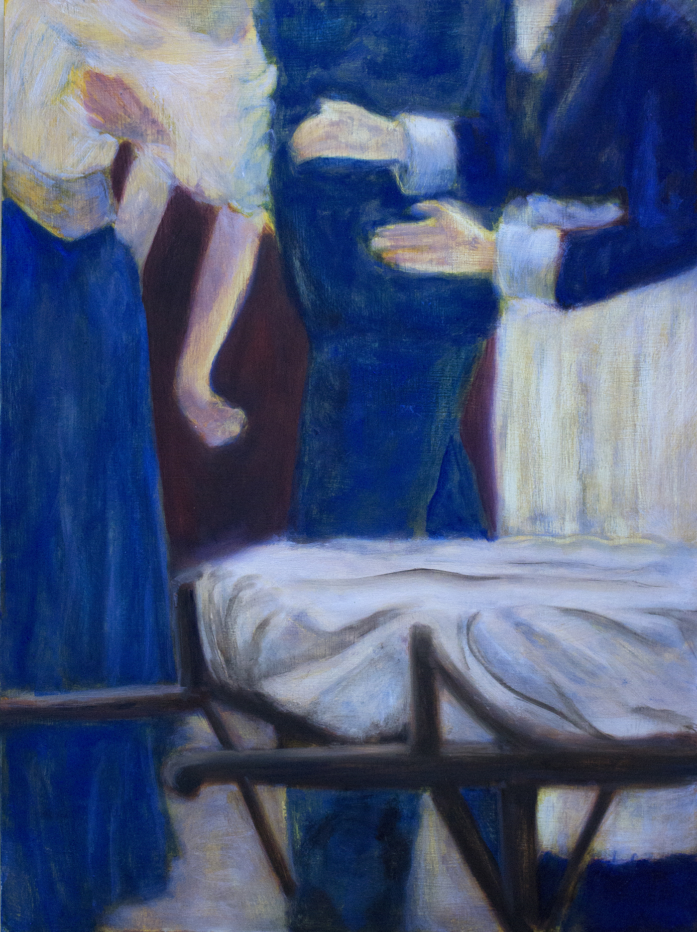 The focus of my work is the confinement of women, diagnosed with hysteria in asylums during the late nineteenth century, as a symptom of patriarchal values of the time. It consists of a number of paintings and an installation of old metal bed frames, displayed at the Abbey on Sherkin Island, a monastic site rich in historical associations. The paintings are based on archival photographic images of women at La Salpêtrière, in Paris, as well as a history painting by André Brouillet, “A Clinical Lesson at La Salpêtrière”, painted in 1887.