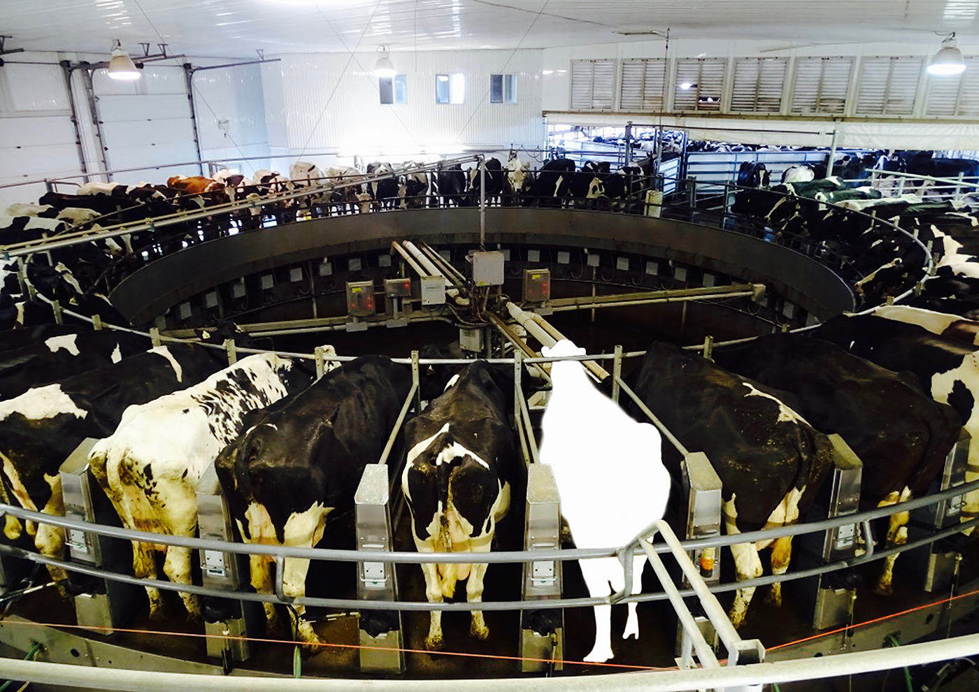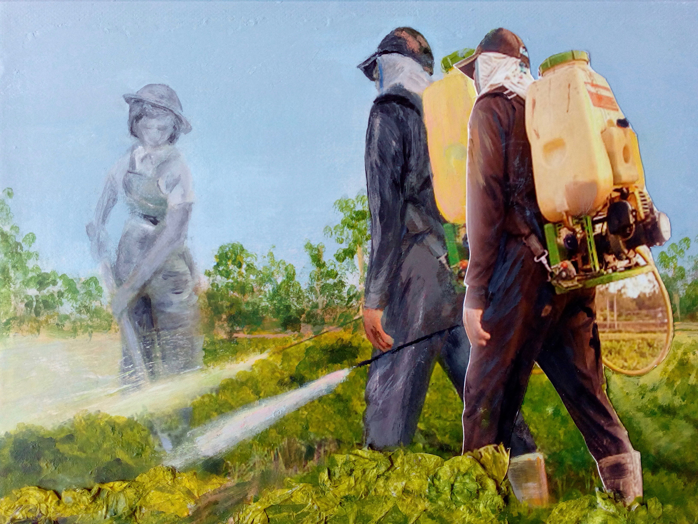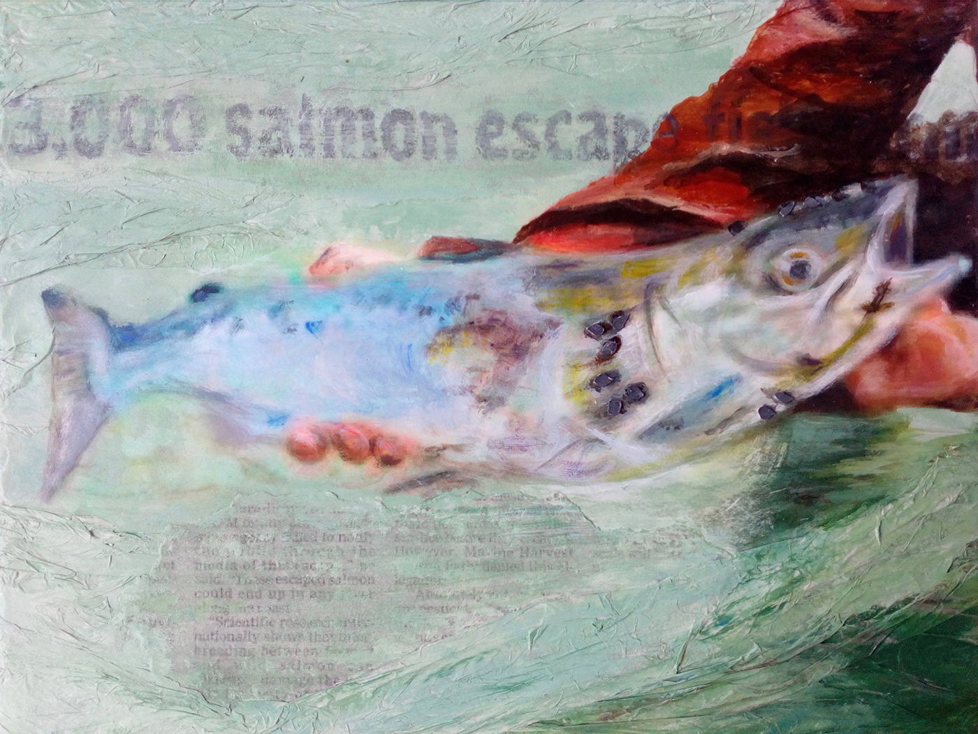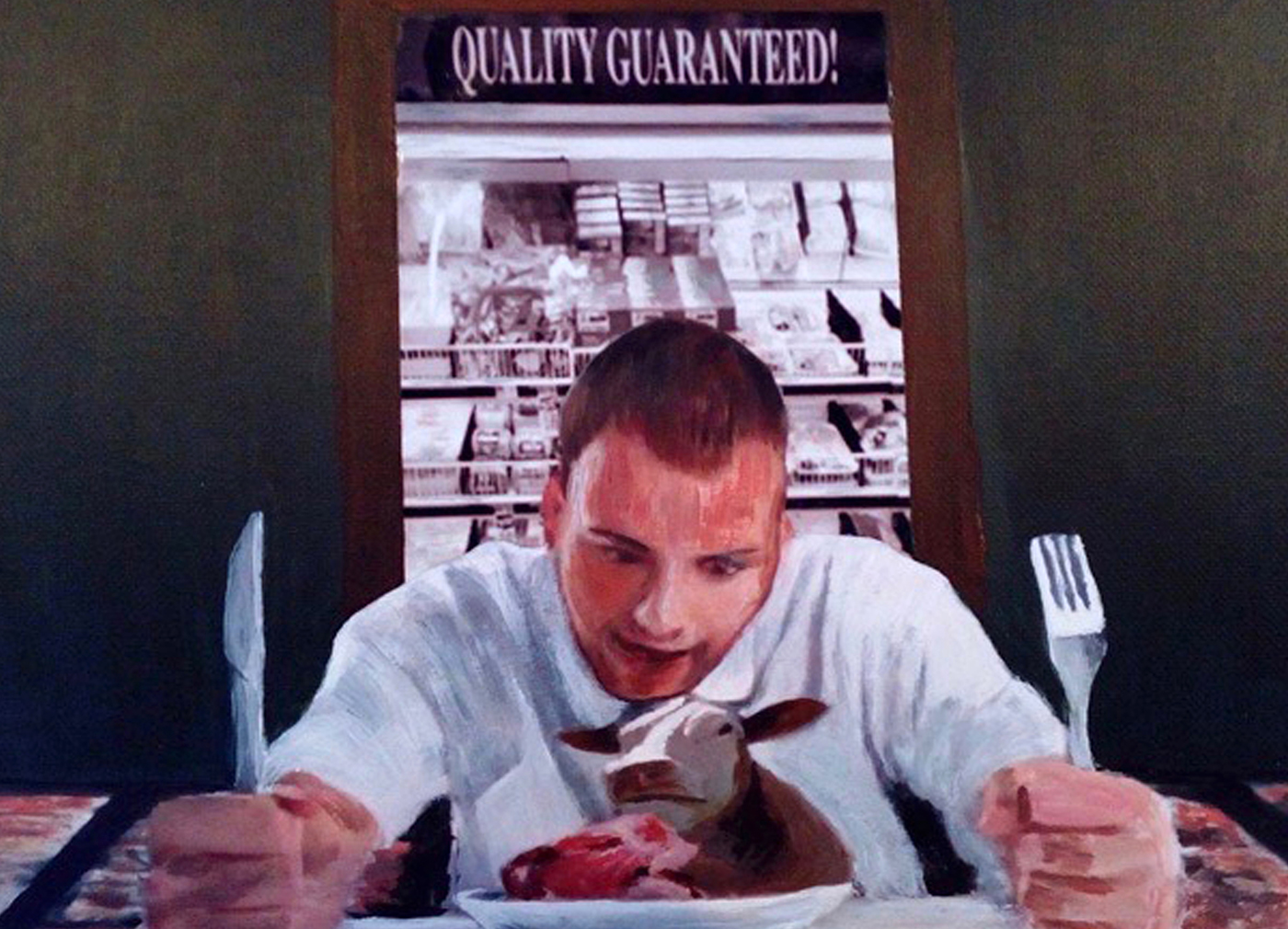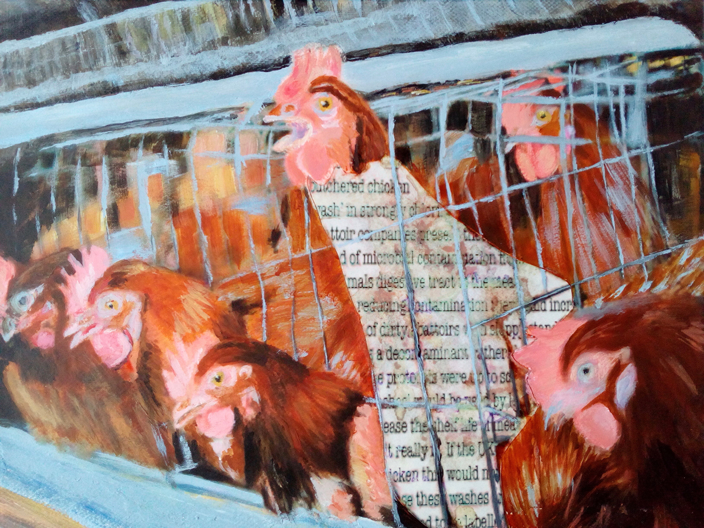 In a series of mixed media montage paintings, narratives are satirically disclosed, questioning the integrity of corporate intervention. Mono-cultured and GMO crops are heavily sprayed with toxic pesticides and herbicides that threaten human health and the eco-system. Rapid turnovers of animals, poultry and farmed fish may maximise profitability but in consequence, many are kept in appalling overstocked environments. Documented images reveal cattle protesting whilst a short animated video depicts a potential scenario formed by overfishing and plastic pollution.