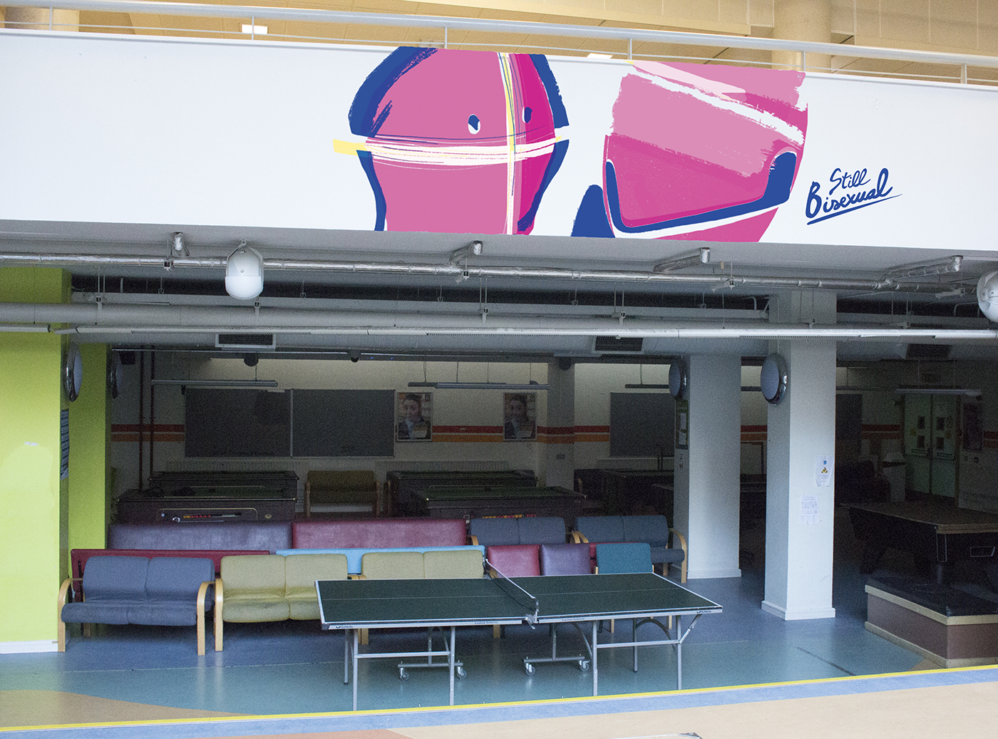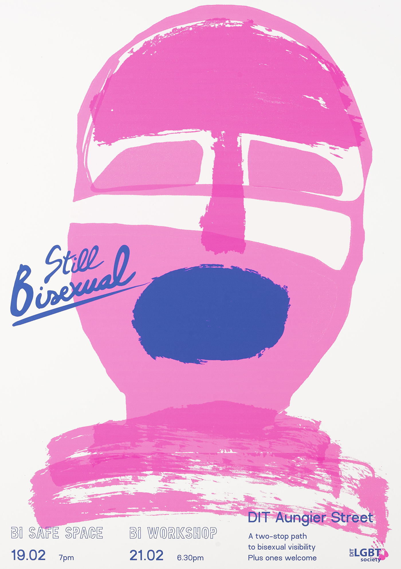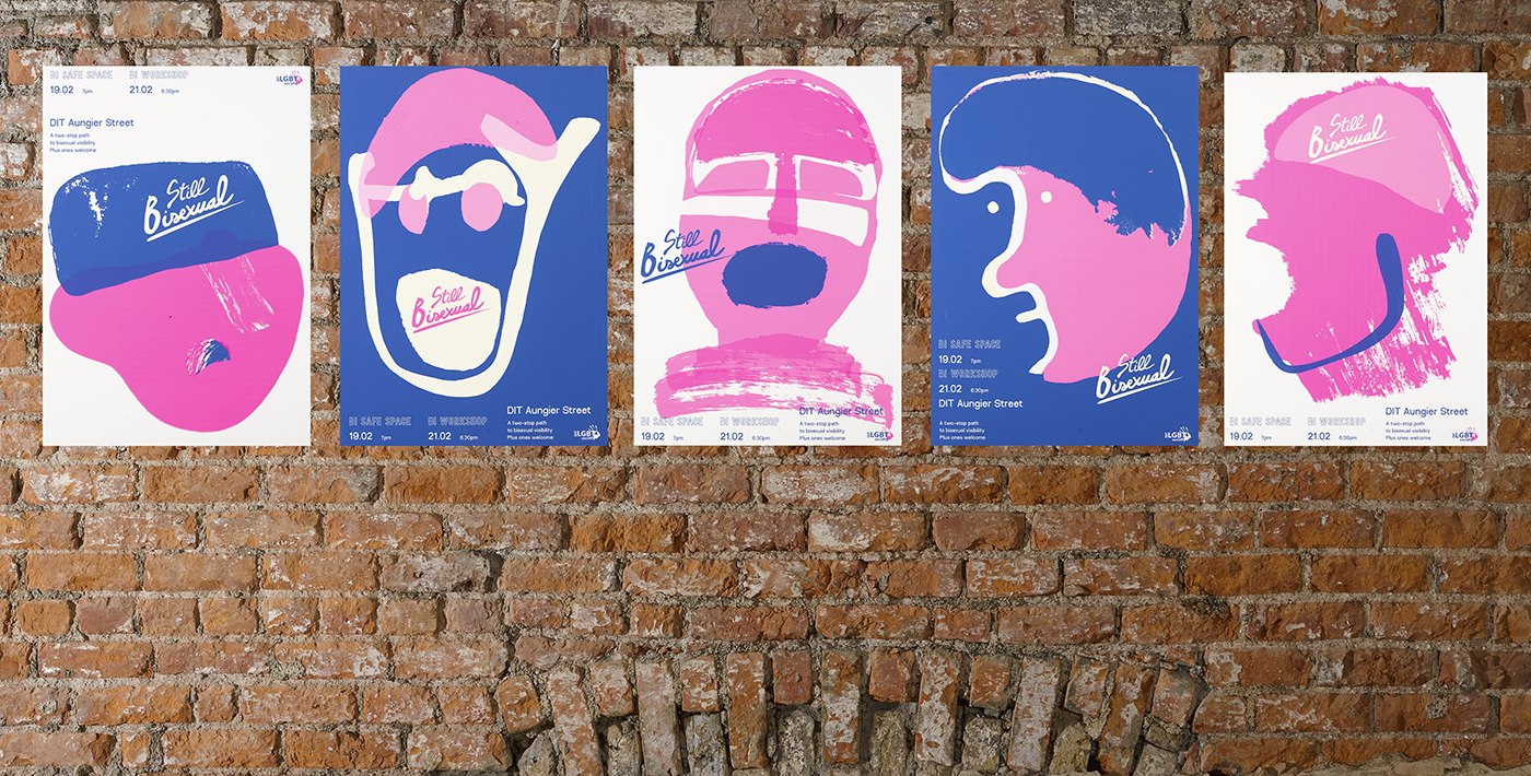 The aim of this project was to develop an appropriate event brand identity for bisexual-specific events for DIT's LGBT Society. The solution had to be unique within the foray of LGBT representational organisations in Ireland and abroad, and it had to help the young, bisexual minority in DIT establish itself as worthy of recognition within the student body. Studies found that more needs to be done to integrate the LGBT community with its quiet bisexual majority. A number of touch-points explored include posters, murals, badges and social media placement. These were chosen for the LGBT Society, and for the community, to produce better communication with bisexuals beyond word-of-mouth and outdated assumptions.