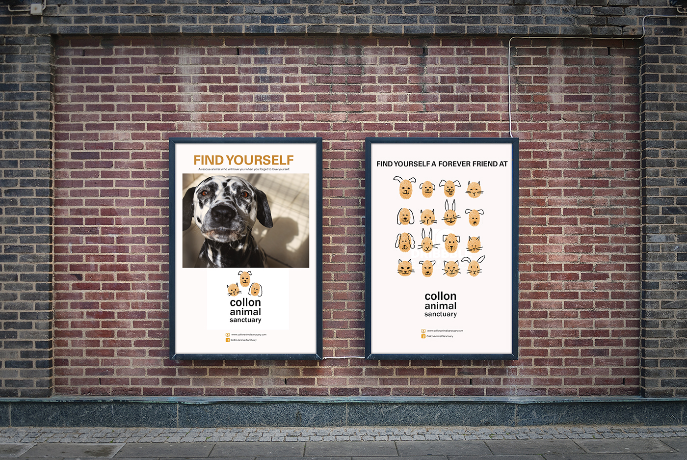 Collon Animal Sanctuary is dedicated to the care and rehoming of many animals. My project is based on a campaign for the sanctuary called "Find Yourself." This campaign is a poster based campaign using photography and illustration. The idea is aimed towards people who want to get a pet. The posters are laid out like a lost dog poster so instead of advertising a lost dog I included for example "Find yourself a forever friend." These various quotes on the positive benefits of owning a pet will encourage people to visit the sanctuary to get their own pet. My branding is based on fingerprint designs I that I gathered from visitors to the sanctuary. I then added my own interpretation of animals in the sanctuary to the final designs. This adds a personal and unique element to the overall brand and the campaign. I've also included a care package design that the sanctuary can give to new pet owners which includes a blanket, toy, food and the branding design on the outside of the box.
