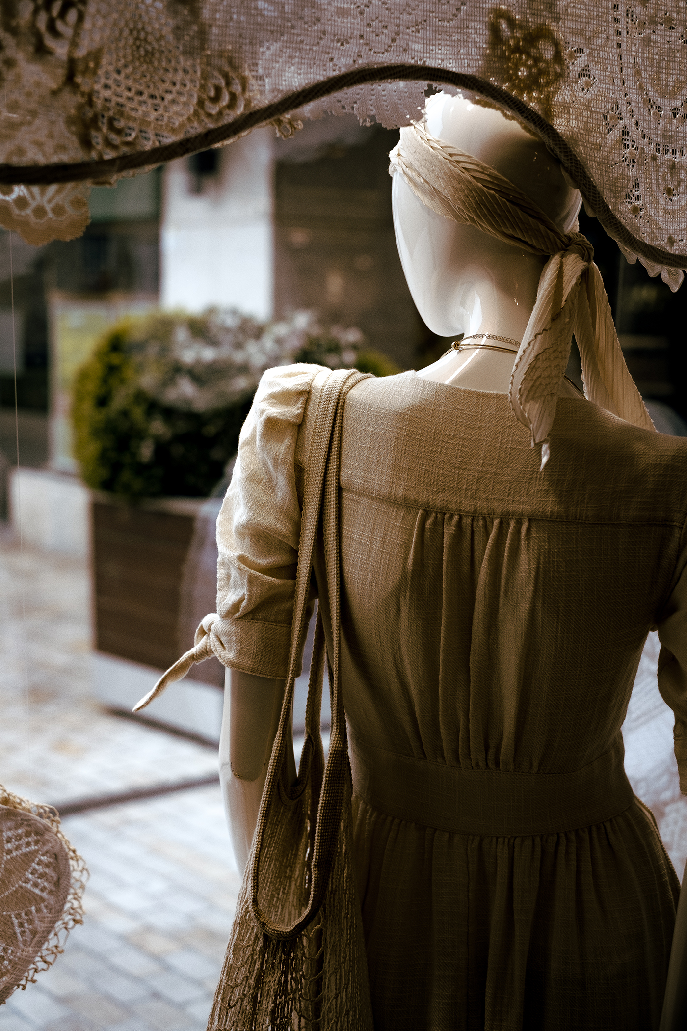 My window design was based on the Kinship trend for S/S 18. This trend inspired my idea of combining lace and crochet together to create floating shapes. I used vintage, new and handmade crochet and lace in each shape and kept a subtle palette of creams and biscuit tones. In creating a modern style dress I am giving this window a new age lift, while keeping with the subtle old fashioned shapes and design of the crochet and lace. While kinship is about freedom and easy living I feel I have created a contrasting meaning by adding a modern edge.