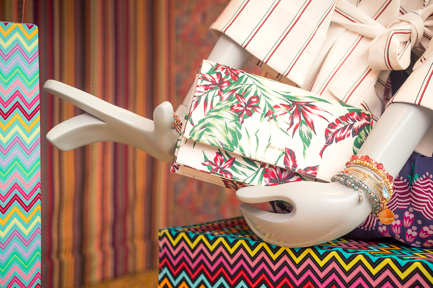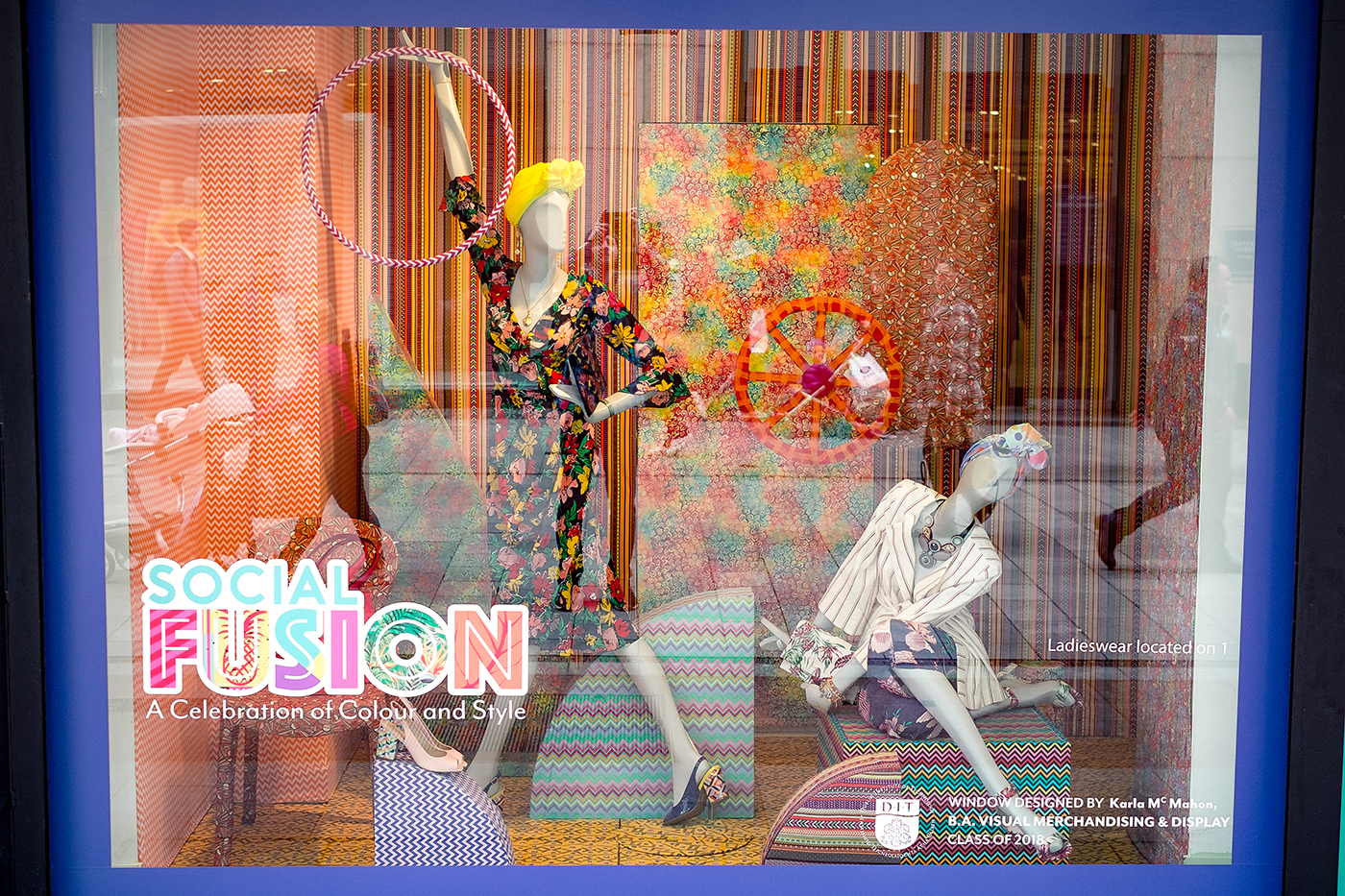 My window design was based on Social Fusion and was displayed in Arnotts. Social Fusion is a theme based on social occasion and celebration. Dublin is a melting pot of cultures and nationalities. I embraced this through bright colours and bold fabrics. Using shapes and random objects I covered everything in a range of different quirky fabrics. The patterned fabrics and random shapes were a symbol of the different nationalities and social gatherings in Dublin today.