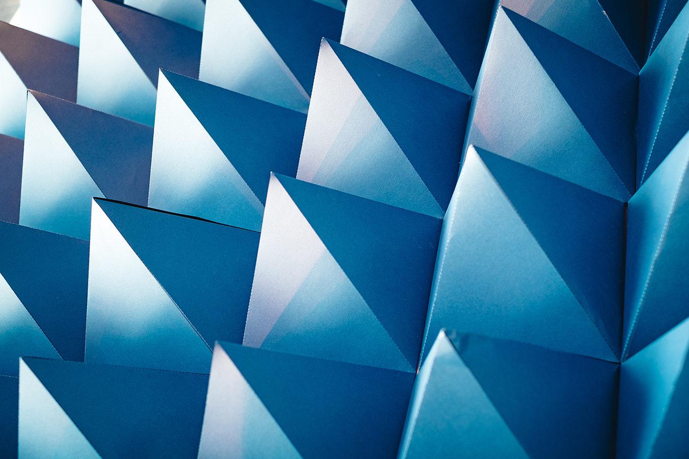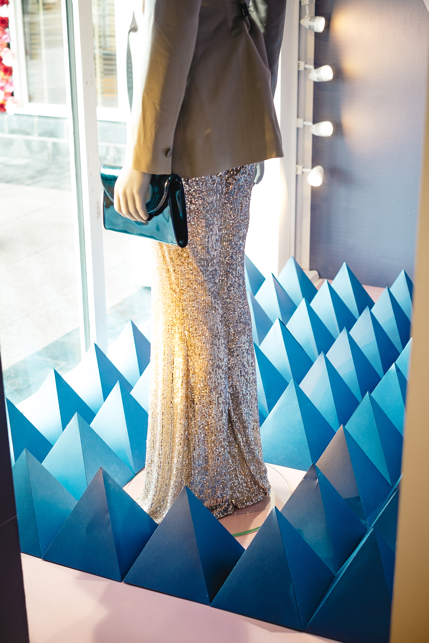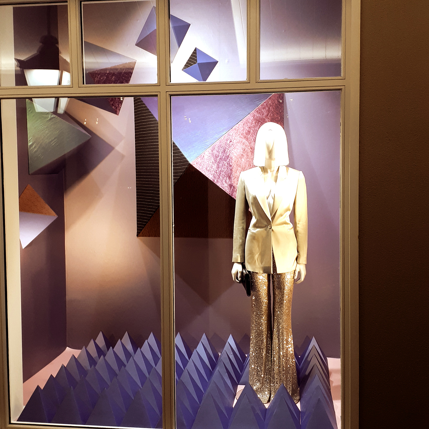 The Psychotropical S/S'18 trend on WGSN inspired me for this project. Using the images from WGSN, I was inspired to research various triangular shapes, the colours used were also part of the trend and different patterns were used to reflect a space/futuristic theme. Pyramidal shapes were sprayed and then covered with textiles and the floors were covered with Sapphire coloured card. The walls were covered with Sapphire vinyl and the mannequin was dressed in silver sequin trousers from emerging Irish designer, Umit Kutluk with a blazer from Reiss.