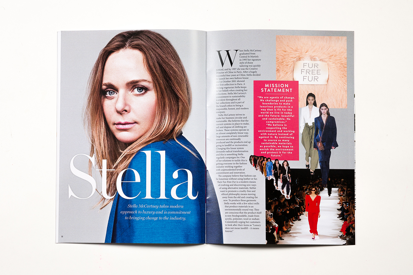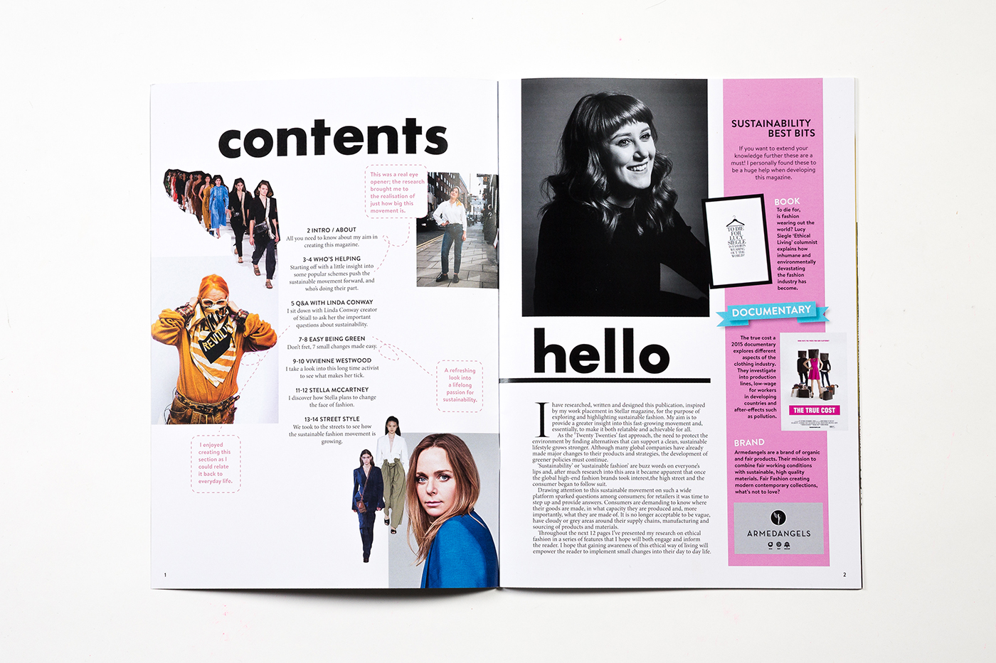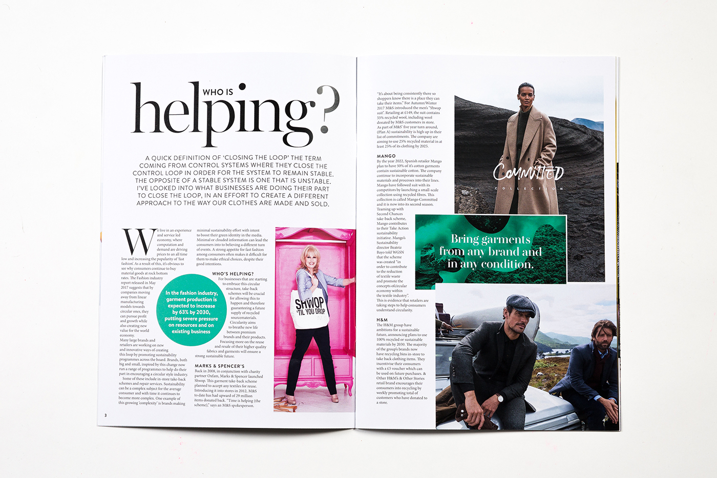 I have researched, written and designed this publication, inspired by my work placement in Stellar magazine, for the purpose of exploring and highlighting sustainable fashion. My aim is to provide a greater insight into this fast-growing movement and, essentially, to make it both relatable and achievable to all. The name ORB relates back to sustainability and the efforts being made to encourage a circular style fashion industry. Throughout the 12 pages, I’ve presented my research on ethical fashion in a series of features that I hope will both engage and inform the reader.