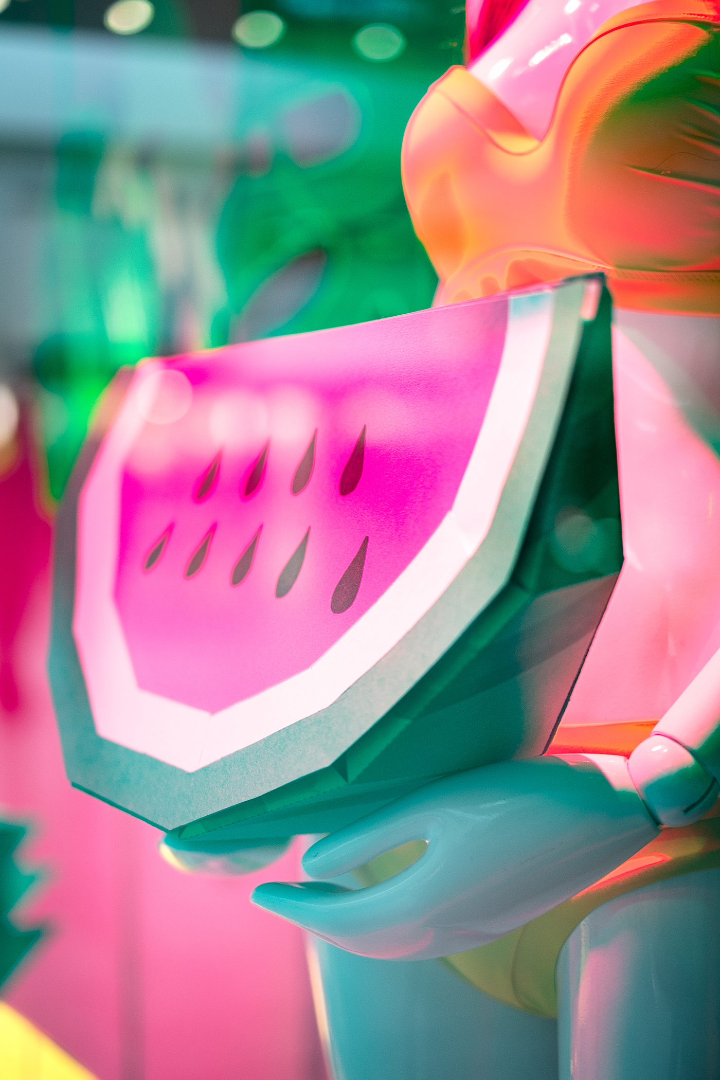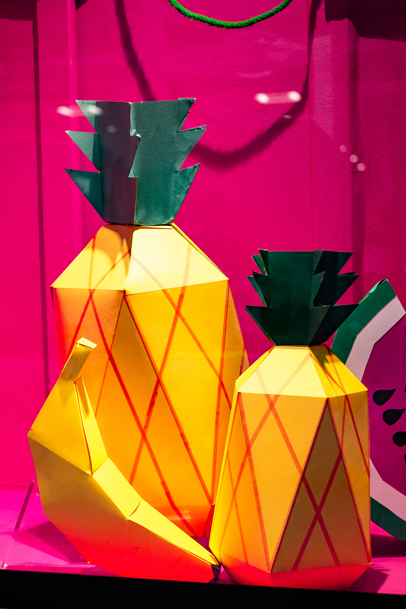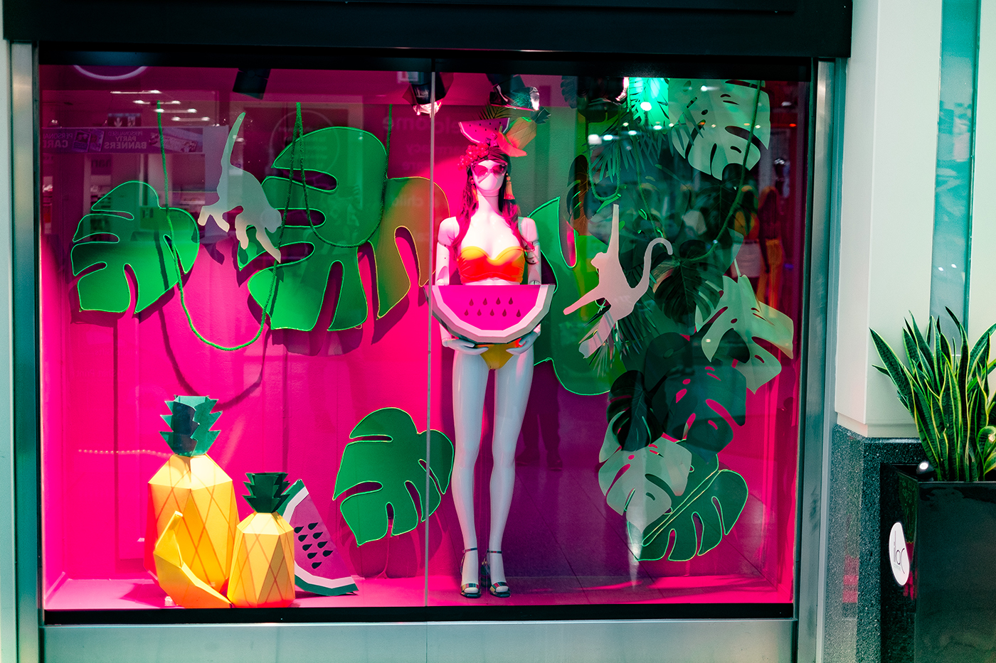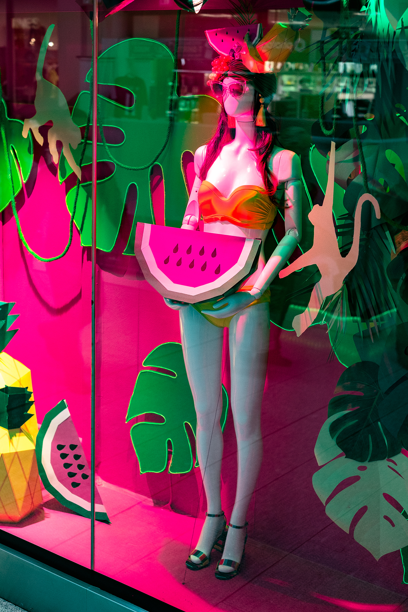 My window display is inspired by the Psychotropical theme on WGSN. I wanted to create a bright vibrant tropical display for Debenhams, something that would be eye-catching and has a spring/summer feel to it. I used foamboard to create the monstera leaves for my back wall, I then added EL wire to these to make it more vibrant. My fruit is all handmade, using card and markers. The mannequin’s headpiece is inspired by Carmen Miranda, with tropical fruits which were also handmade. I finished off my window by adding tropical leaves, vine and monkeys. I wanted my window to have a Fun, energetic and Tropicana feel to it.