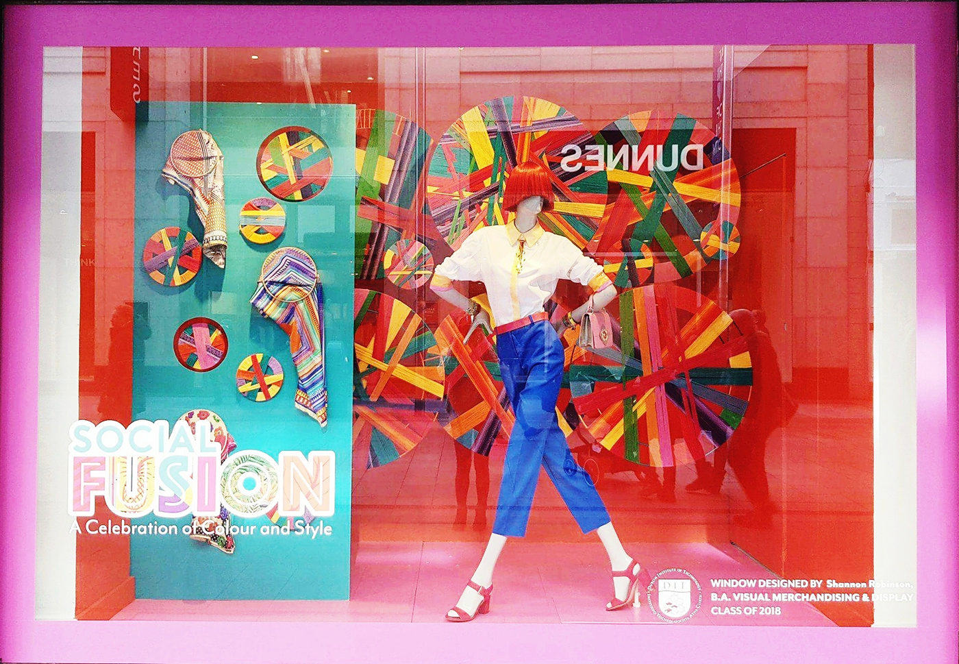 Social Fusion is the celebration of social gatherings and events. The concept was to establish Arnotts as a destination where social occasion and celebration are fused as one. As Social Fusion is a celebration of culture and colour, my window display was focused on print, colour, textiles, weaving and culture. The aim was to create a colourful window display that catches the eye by the use of weaving patterns to emulate a cultural theme. I decided to suspend large hoops that would hang to the rear of the window, with a board to the left-hand side which would display scarfs. However, I wanted the mannequin to be the main focal point and positioned her at the front in bright colourful clothing. Overall, I wanted my window to represent colour, fun and culture.
