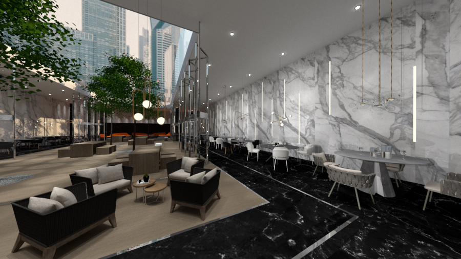 The materials and colour palette I chose for the building is quite neutral, with a pop of orange used throughout to enhance certain design features.