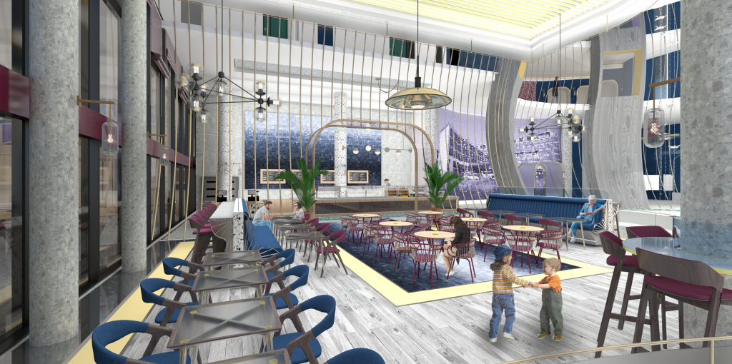 My concept design was based on the structure of a pigeon’s wing and was developed by experimenting with the shape and scale. From this, I came up with 2D and 3D structures which I then used to design components within the building including the void, furniture, patterns and layouts. The design also stays true to the existing building by keeping the original features and structures such as the viewing tower and famous mosaic tiles.