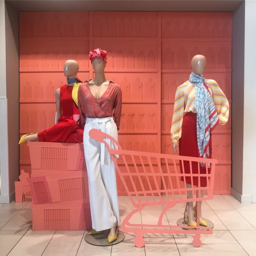 My aim was to create an amazing visual display that would be suitable for both a high-end store and a traditional Irish grocery store or supermarket such as Dunnes Stores. I deeply researched trends and colour theories, looked at clashing prints and decided to base my window off the Pantone colour of the year ‘Living Coral,’ which featured in the trend ‘Creative Manifesto’ on WGSN. The display is totally block coloured and grabs customers’ attention from all angles.