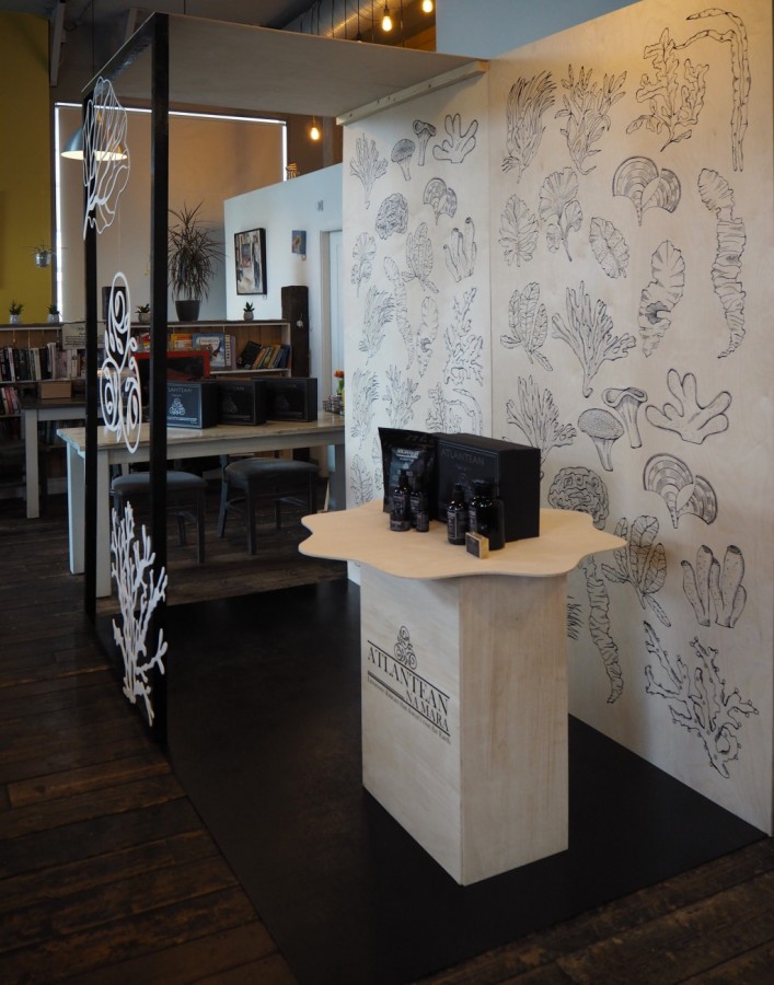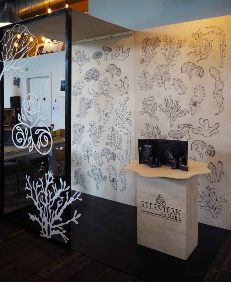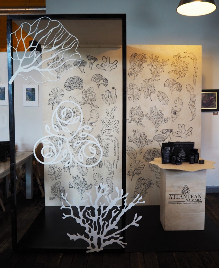 For this project, I designed and built a pop-up display for an event to promote Atlantean Na Mara. This Irish company has, at its core, a belief in working with nature at a renewable level. I was inspired by the S/S 19 trend, Common Ground, which celebrates natural materials and sustainable production. In 2019, nature becomes a growing focus in contemporary design. Since their skincare products are made from seaweed, I highlighted this with illustrations, whilst also showcasing their Celtic style logo. Organic materials such as birch plywood, timber and MDF are used for props in this sustainable story.