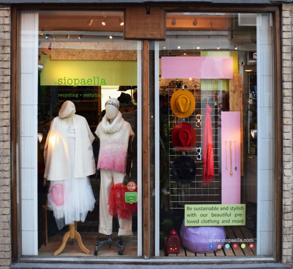 With this installation, I wanted to convey the sustainable message of Siopaella in an accessible manner. As the effects of fast fashion become increasingly apparent, consumers are discovering the joy and creativity in preloved clothing. I kept materials simple, accenting the preexisting fixtures in store. A gentle colour palette brings a freshness to the display while allowing the product to pop. As space is constrained, it was important for me to create a floating display. Fixtures are suspended towards the centre of the window, helping to create a more open sense of space, as well as establishing a strong focal point. Every material for this installation was recycled, from the wooden panelling to mixing leftover paints.