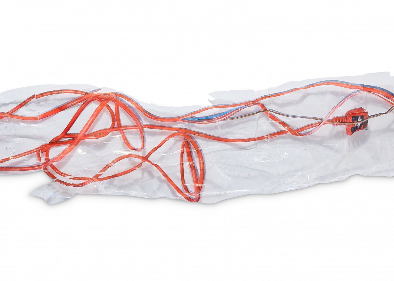 Irena uses a process to transfer images onto Sellotape creating an illusion of the material/object. Creating an archive which inhabit the characteristics of the materiality of the Sellotape. Tension is created within the piece through the activation of the objects, a ceramic suspenders by a rope, evenly been balance by another. There is also a contrast between the industrial and organic, this can be seen through the materials and processes used. The work can be seen as provisional, it can be assembled and re-assembled again, creating different iteration of the work. Irena seeks to create a dialogue between the material, the space and the viewer.
