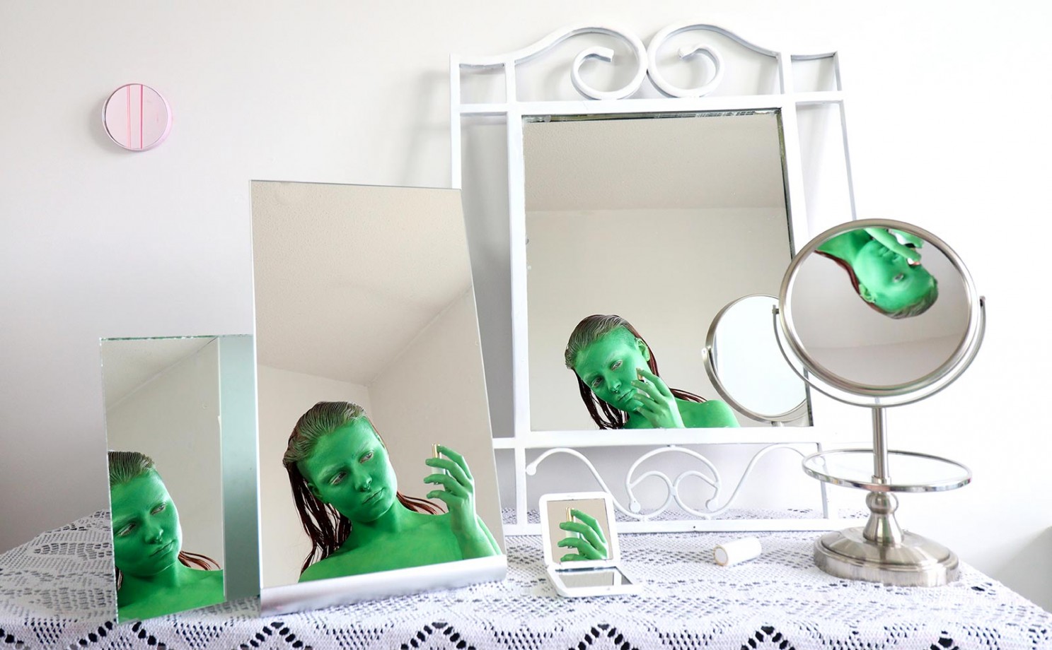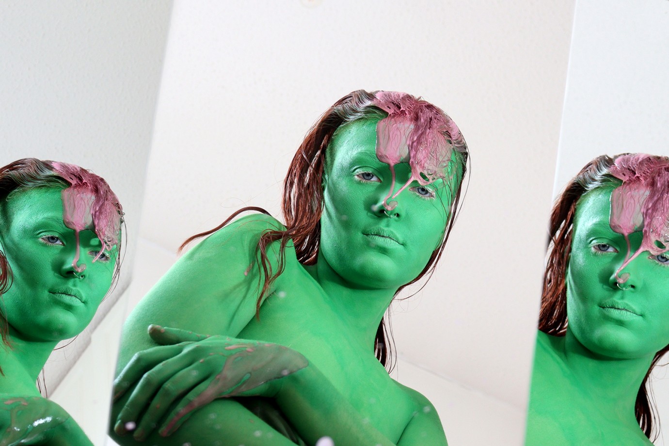 Following the form of a triptych, Part I of the work depicts an uncanny environment, re-occurring across three screens. While familiar in its domesticity, the space is void of colour and glows with an uncertainty. Tangible forms melt away into the emptiness, as it appears enclosed, isolated and internal. Coated in green flesh, a figure rests in each fragment, contemplating. Encompassed by mirrors and transformative potentiality, green corporeal reflections strain through a process of slow examination. Hands grasp towards an understanding of the self, repeatedly raising a mirror in the hopes of a new reflection, while others toil to retain their grip. Aware of the history and politics of looking, there is a sustained push and pull between the private and the social; the acquiescent mourning of the predetermined, and the active strive towards an un-doing. All modes of linearity collapse, as time gathers and repeats, slipping out of sync.