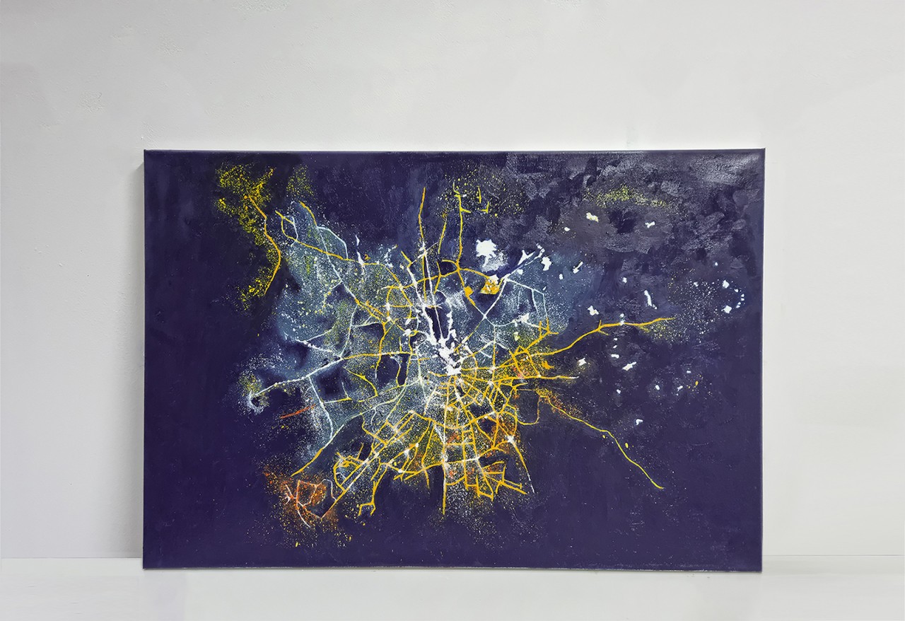 Maps rendered important sources for the creation of the paintings. The widespread use of maps is to show diagrammatic representation of an area of land or sea showing physical features, cities, roads, etc. In this project, maps depicted as night lights portray distance, displacement, home, culture, and identity. The paintings depict collages of two countries and migration routes. The action of merging the countries together takes away the distance between the two regions creating a new and special place that speaks value to one’s identity. The paintings of the maps coexist as a portrait of the artist as well as portrait of other people who immigrated to other countries.