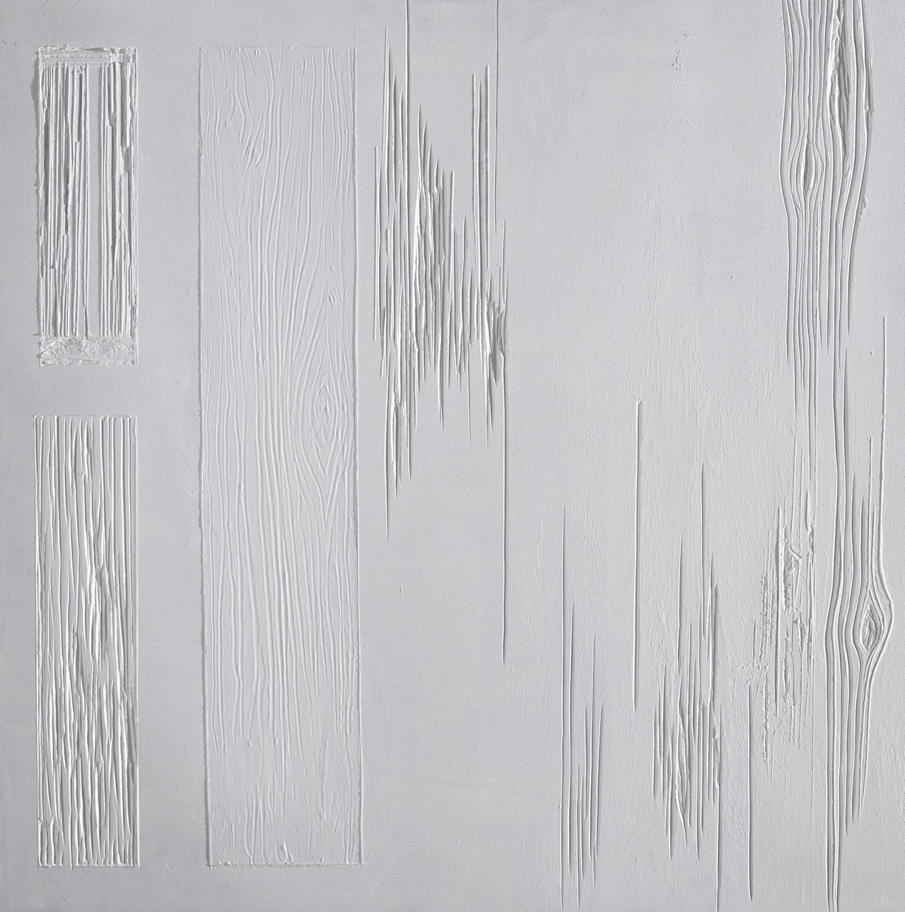 These photographs are accompanied by expanded paintings/carvings on MDF sheets which are removed from their usual function as a construction material. Instead, it undergoes a process of deconstruction through carving and incising to create spurious facsimiles of architectural trace and texture. This process is also applied to heavy weight paper, where domiciliary surfaces’ scuffs and scratches - the forgotten minutiae of physical memory - become scarred white tundras of trace.
