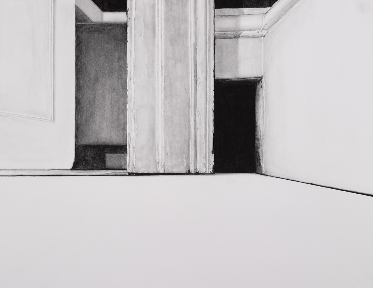 Along side these details of constructed space are graphite drawings of household trace both representative and abstracted. These drawings also include depictions of temporary contemporary ruins such as the demolition site of Hawkins House; one of the many scattered across Dublin’s city centre as older buildings and complexes are rapidly replaced by monotonous shining glass blocks. These ruins possess an ephemerality that contrasts to the sanctity and permanence lent to their ancient equivalents.