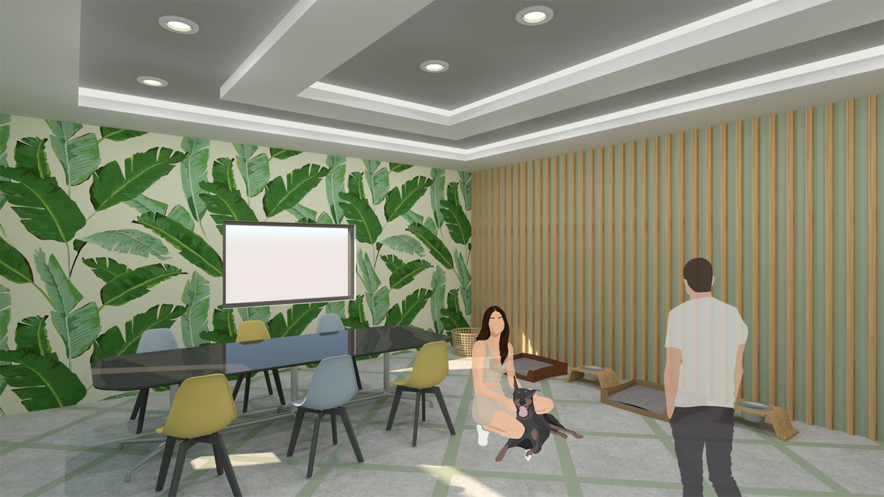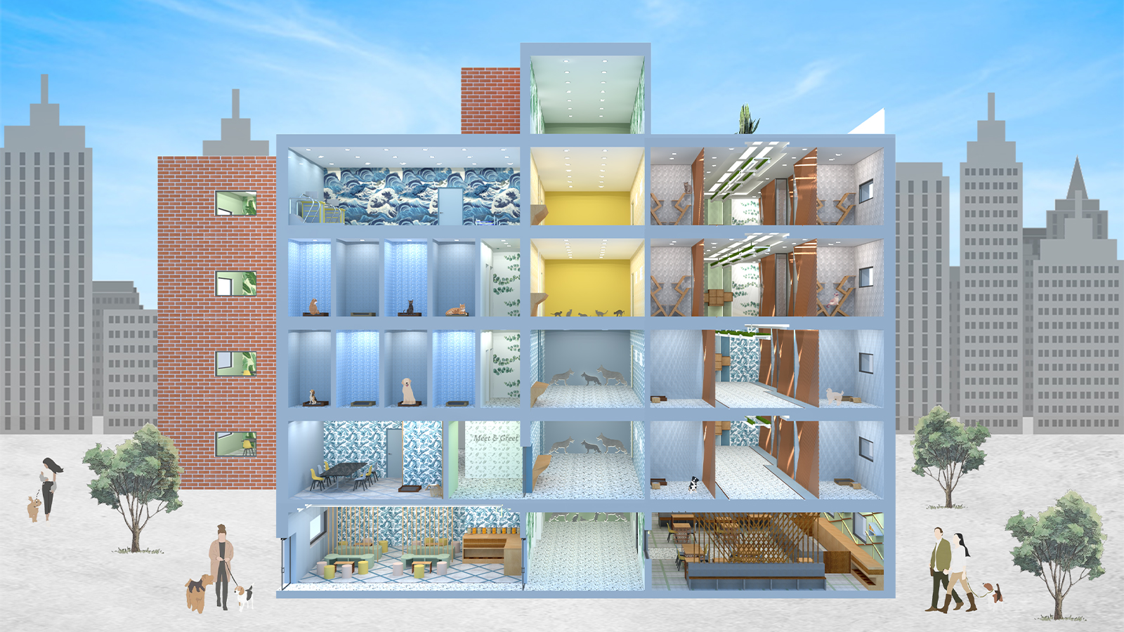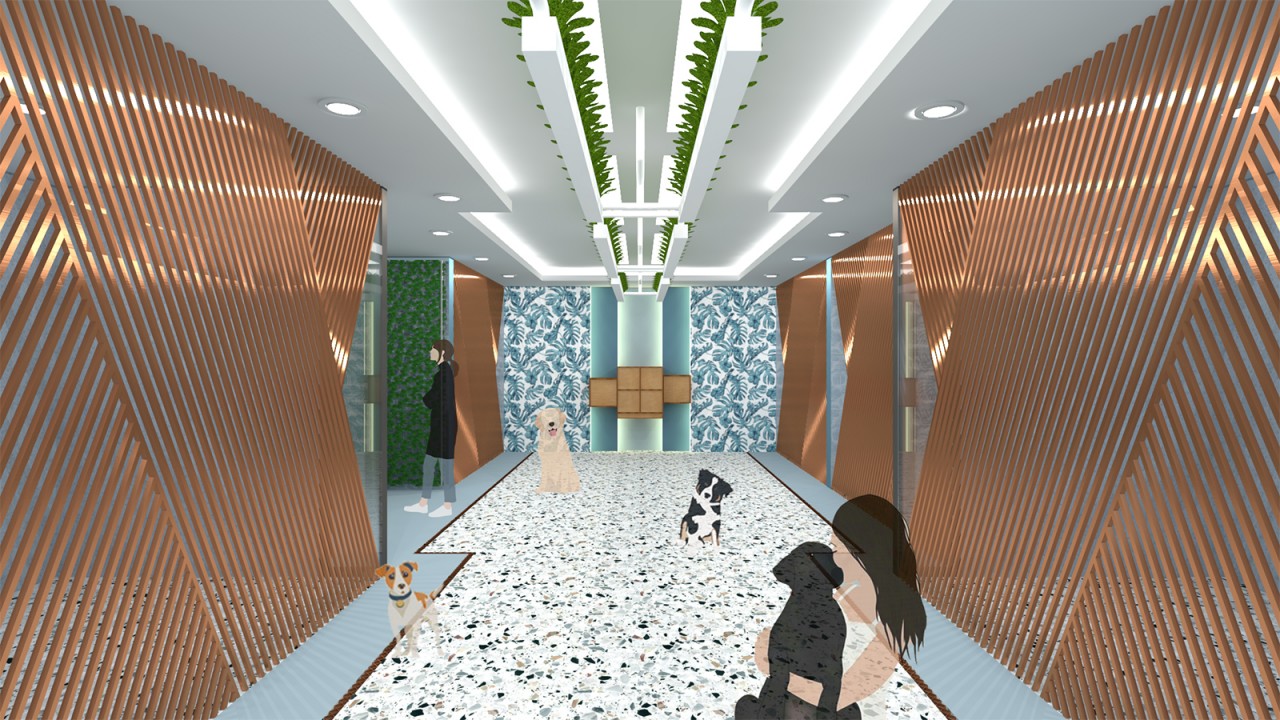 This project aims to convert an urban apartment building into an animal shelter. The building is located near the Phoenix Park on the North Circular Road in Dublin, Ireland. The building has 4 floors above the ground floor, with a flat roof and a southern elevation to the front of the building. It was constructed approximately in the 1990s and its façade is mainly masonry and glass. The building will be operated by an animal welfare society, whose purpose is to create a safe space for cats and dogs. This building will also offer animal hotel services, whereby it will welcome temporary companion pets along with stray, lost, abandoned, or surrendered animals. The centre will offer a full suite of services to its clients including veterinary services, surgery rooms, radiology rooms, accommodation, a grooming area and a rehabilitation centre. A training centre is also provided for those wanting to train their animals, in addition to offering a walking service in the Phoenix Park nearby. In addition to the animal welfare services, the building will also house a commercial pet café and shop which will be open to the public, on the ground floor.