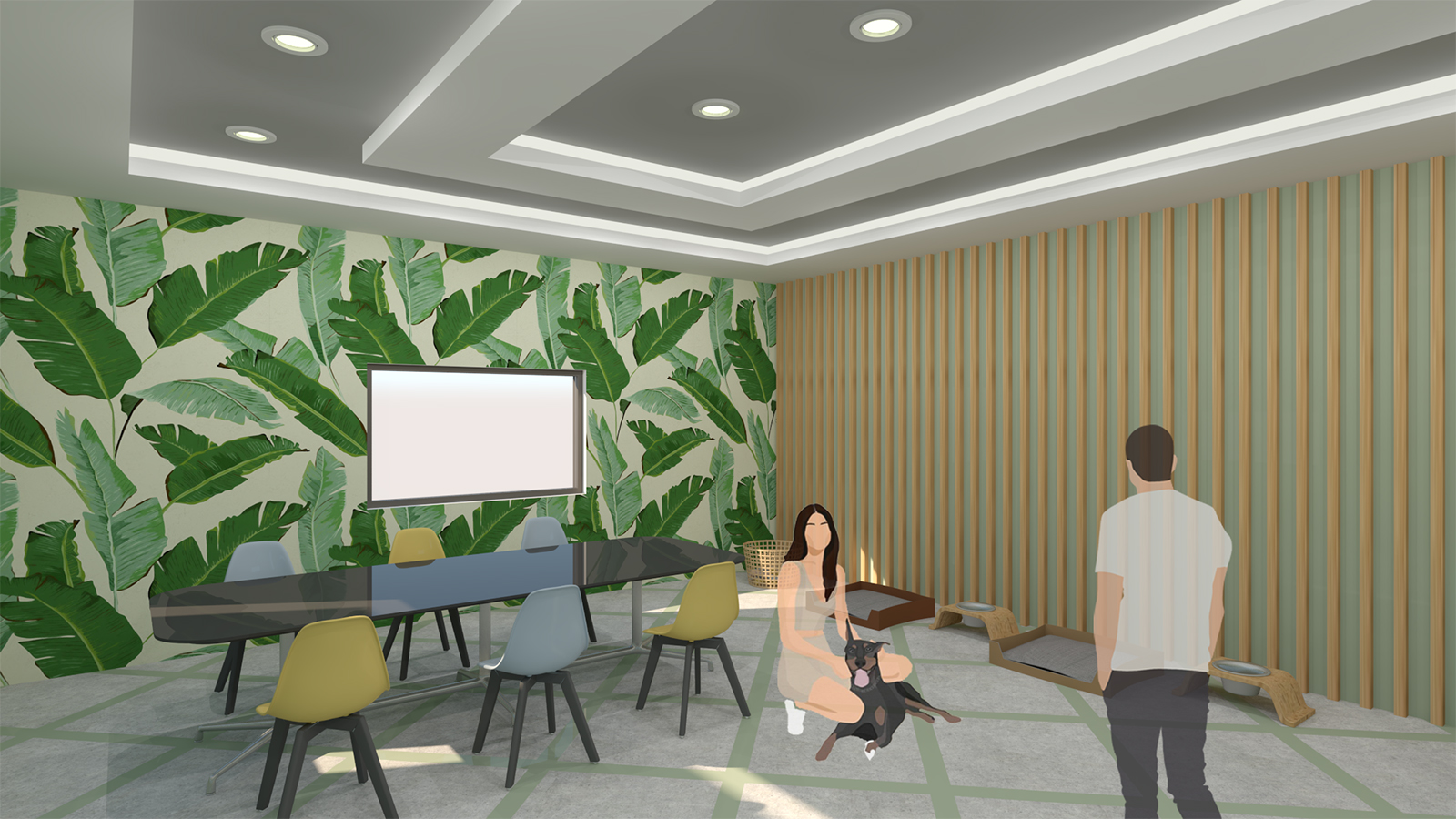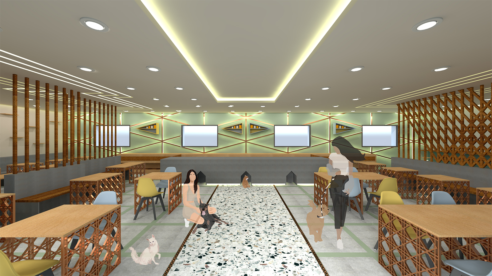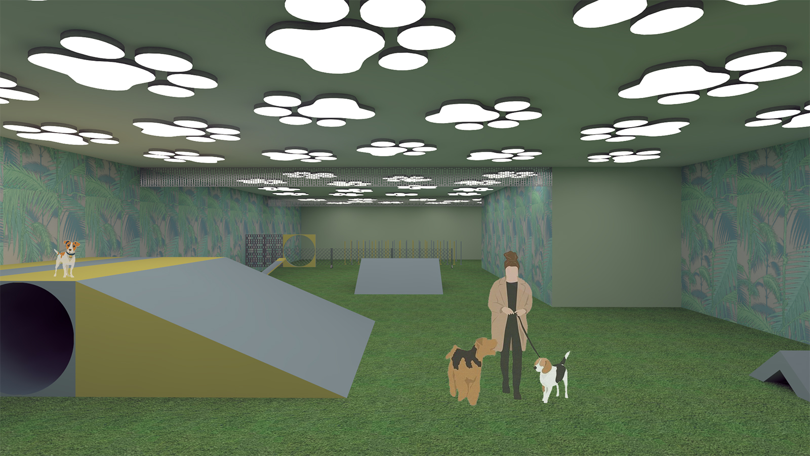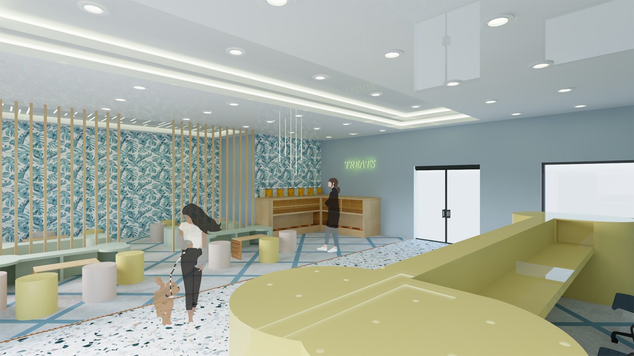 The design influence for this project come from fencing patterns that are used for animal enclosures. The project presented several interior design challenges. Specifically, how to design a practical and functional space while offering an aesthetically pleasing environment for both animals and staff. The building is designed considering functionality which necessitated careful choices of materials and surfaces to ensure they will be hard-wearing and durable. Surfaces need to be washed and sanitized daily which again influenced choices. The colours used were chosen to reflect the colours perceived by animals rather than humans. Furthermore, all the lights are dimmable to imitate natural daylight and to reflect a natural circadian rhythm for the animals.