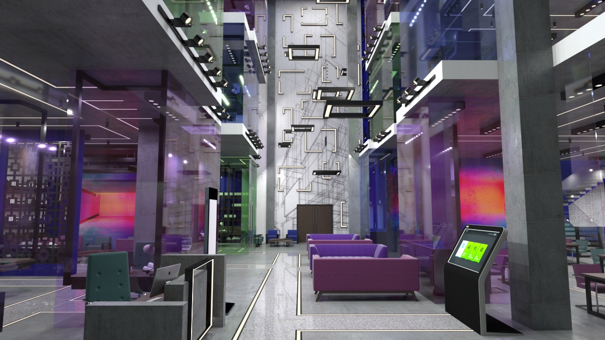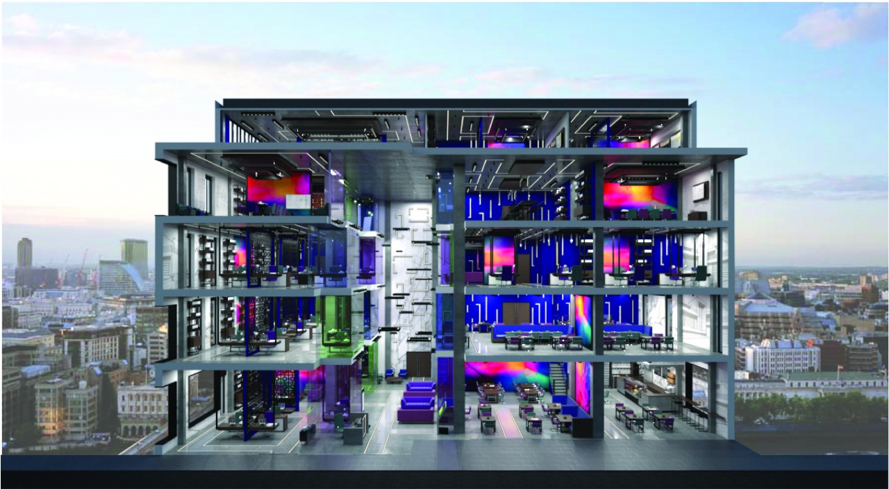 The building offers a range of spaces designed to allow for a fully flexible work environment. These spaces include; hot desks for short-term users which can be booked through the building’s booking system, office pods for long-term users who can display their work through their outward facing office pod in the building’s exhibit space, collaborative rooms which come equipped with a range of different spaces to accommodate cooperative or cross-discipline work, private spaces to allow for isolated tasks, meeting rooms which come in a range of sizes to accommodate groups of different sizes, as well as a café area. The building also has a library, printing space, and a model making area to provide workers with a fully considerate workspace.