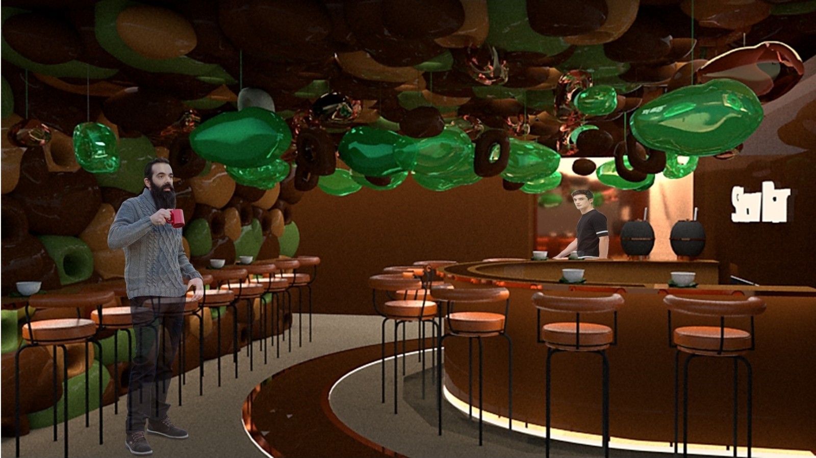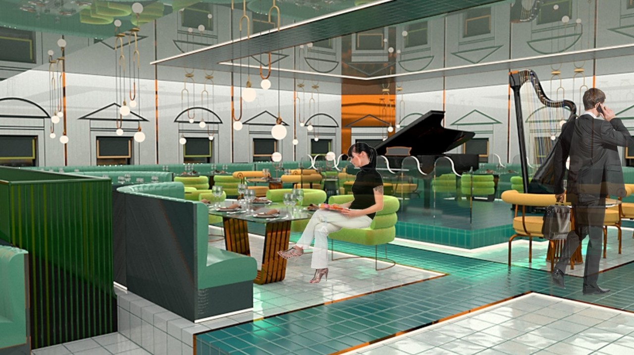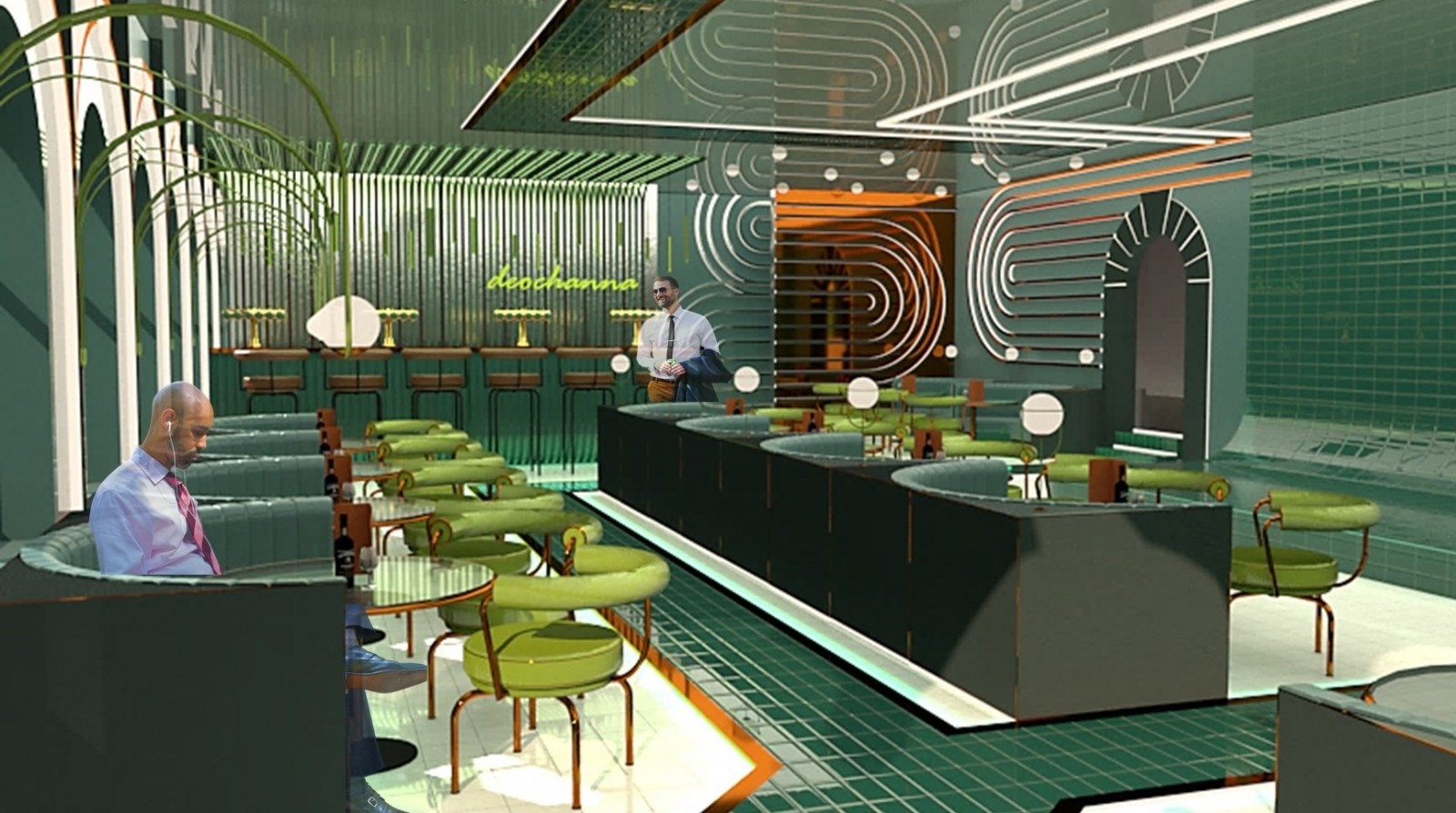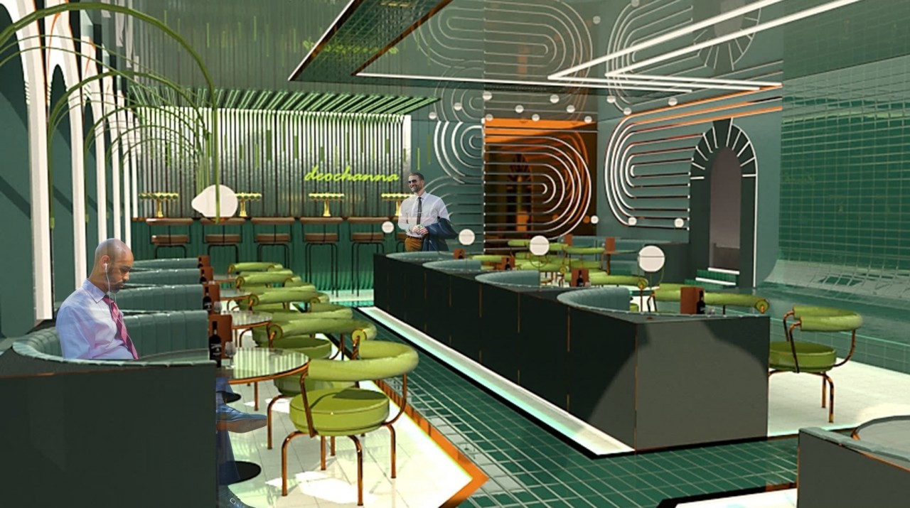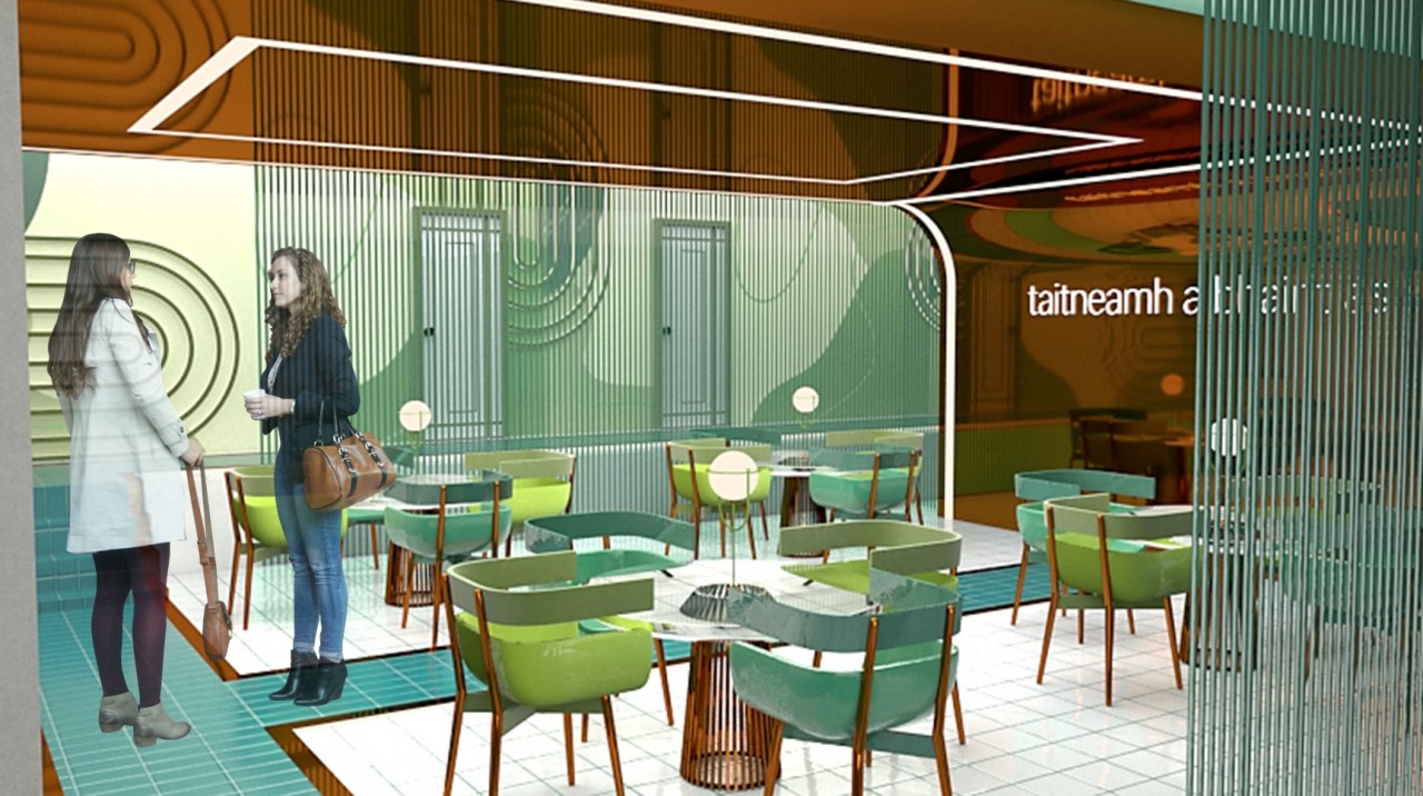The concept for Club Gaeilge was driven by Newgrange, incorporating the swirls that are found in on the beautiful stones and the greenery that surrounds the area. The design is reflected through the whole building we can see the beautiful different shades of green on each level and the swills incorporated in the void and wall details. The basement was inspired by the Irish stew, we see lovely noodle bars around Dublin that are inspired by the dish so the basement of Club Geailge too a spin on that and incorporated the Irish stew into the design creating a very unusual and unique space for people to visit.