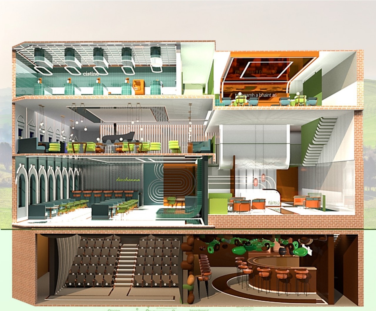 Club Gaeilge will aim to provide a safe comfortable environment for people who want to pick up the Irish language or for people who already are flaunt just don’t get to use it often. There will be a lot of different opportunities for people to use the Irish language, there will be a culinary arts class held in the Irish language and there will be a cinema in the basement and a library on the second floor where you can sit on the rooftop and enjoy the view. There will also be a bar and restaurant where you will be able to order your food in the Irish language. Hopefully this will influence people to start using the language a little bit more in there day to day.