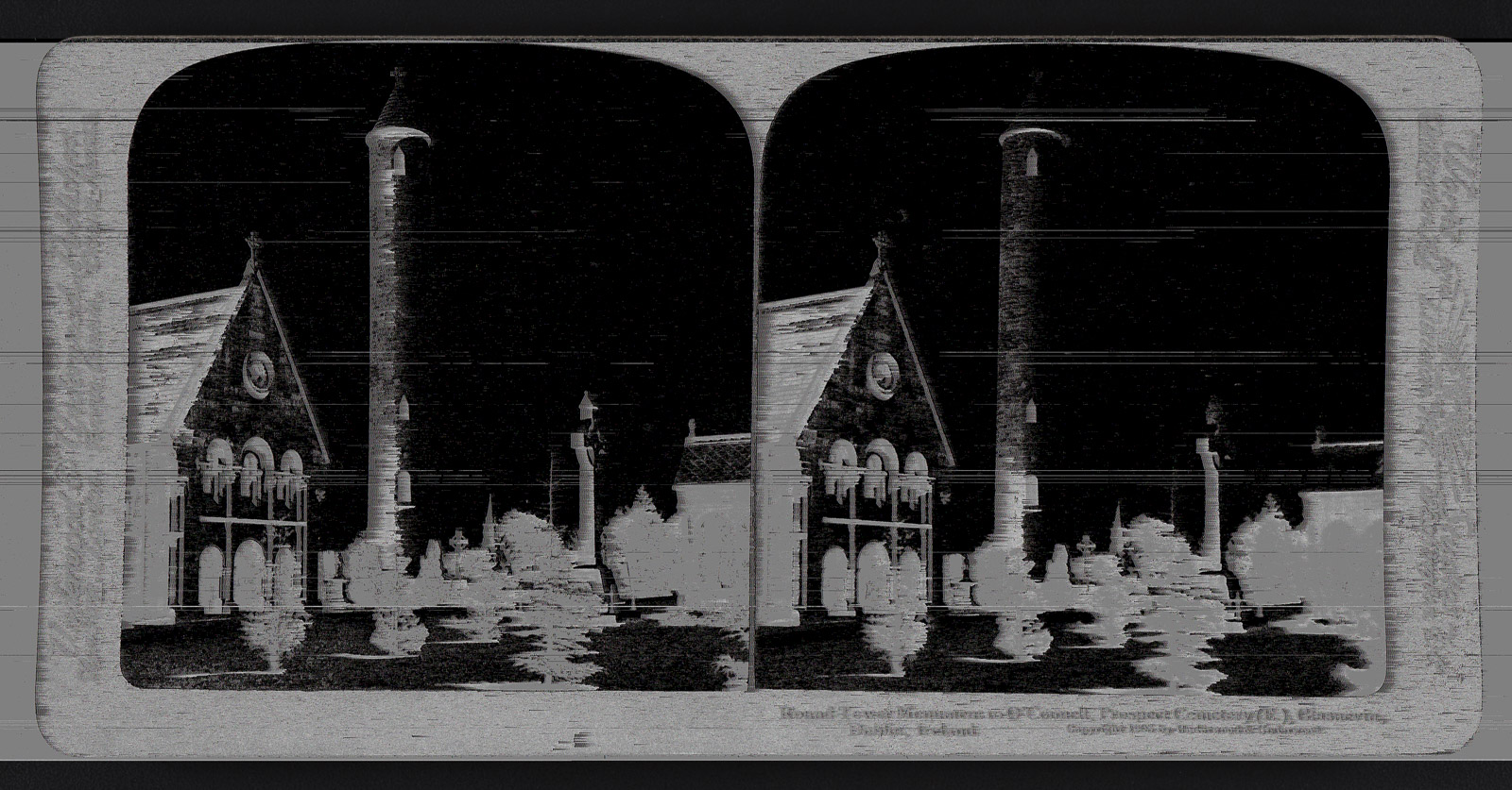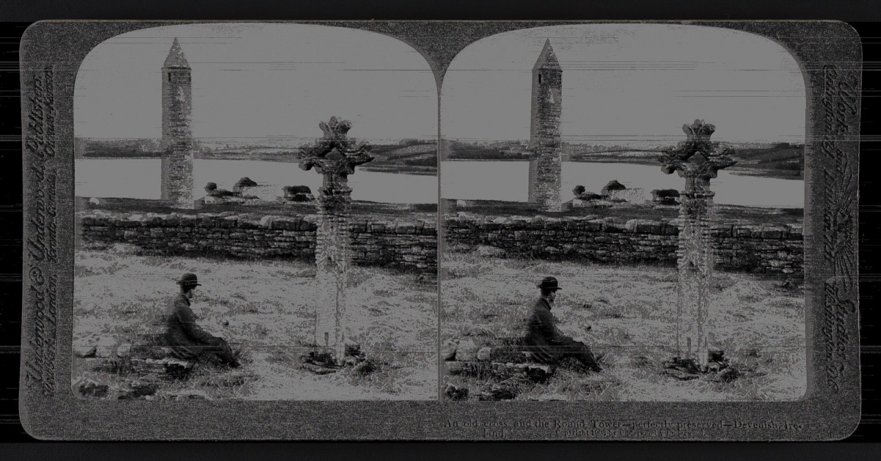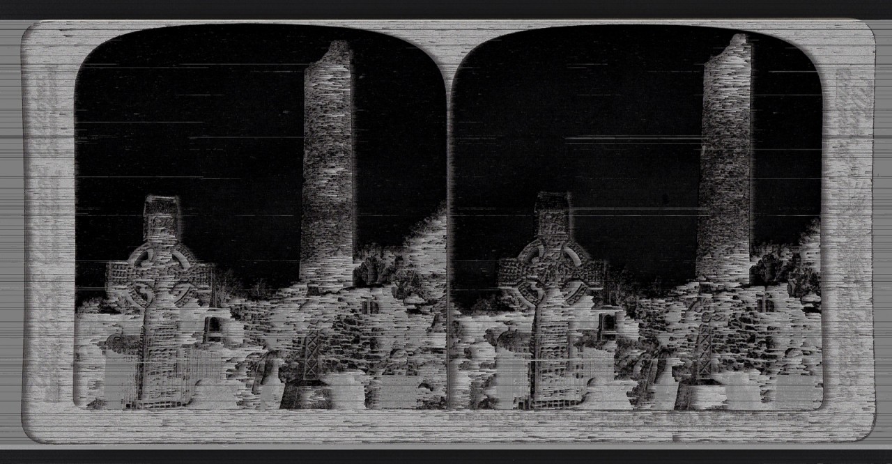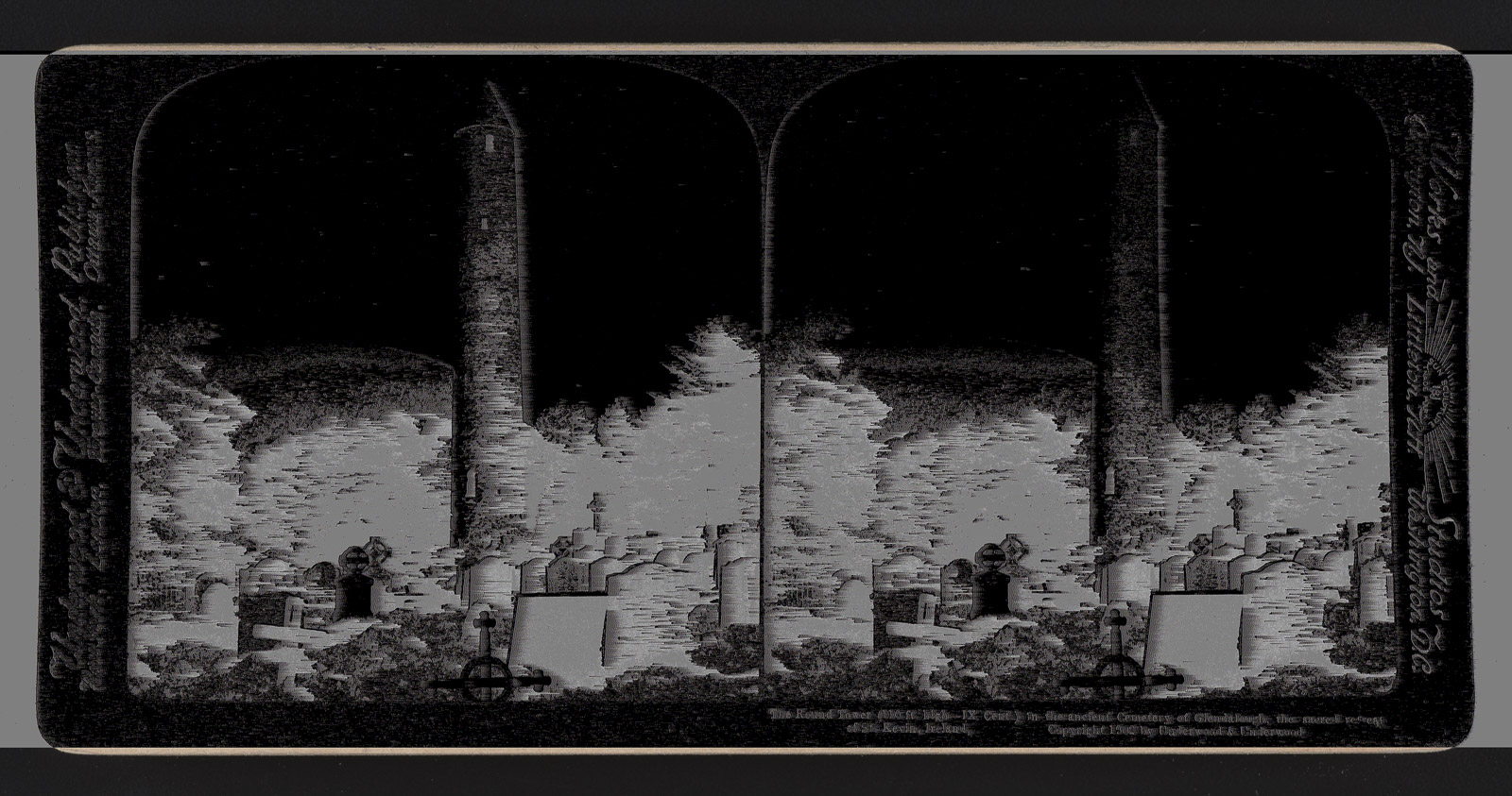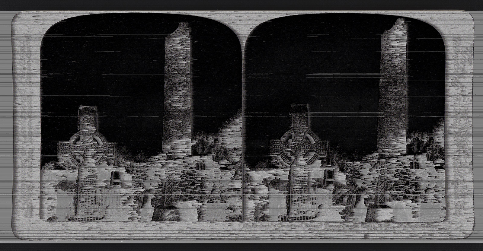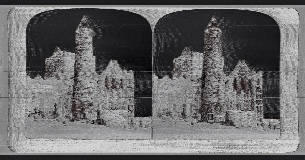 'Cloigteach' explores the relationship between ancient built structures from early Christian Ireland and modern technology. I am trying to draw connections between these futuristic buildings from the past and what remains in the present. Round towers, also known as bell houses or ‘cloigteach’ in Irish, are synonymous with one of Ireland’s most well-known monastic sites, Glendalough. Using an audio software, I am re-imagining this iconic site as part of a meditation on Celtic Futurism.