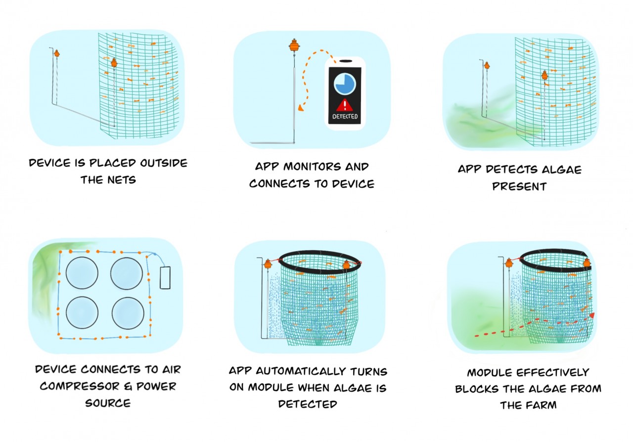 AquaBlock is a system that stops poisonous algae and jellyfish from entering salmon farms and harming the fish. The system is centred around the blocking device which uses compressed air, fed through a perforated pipe that creates a vertical current of bubbles. This current acts as a bubble wall, blocking and protecting the salmon. Its modular design includes multiple barriers that work together. AquaBlock has an accompanying app that displays information regarding the monitoring of algae and jellyfish. The device will insure that the barrier is switched on only when necessary, in an effort to reduce power consumption.