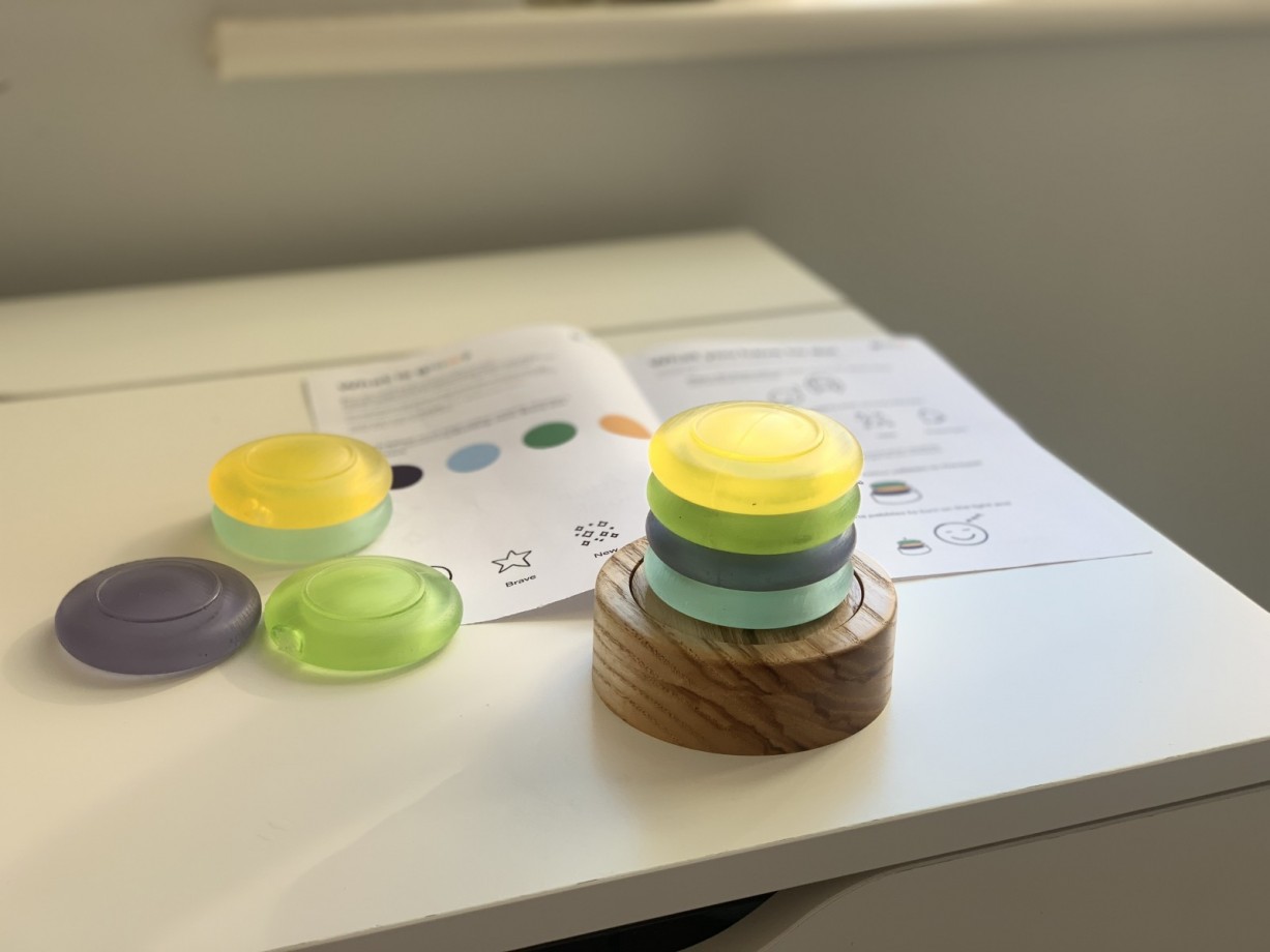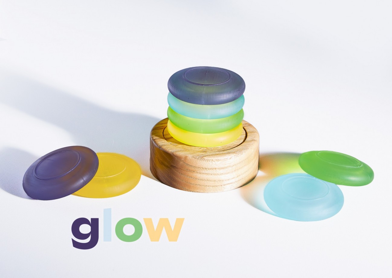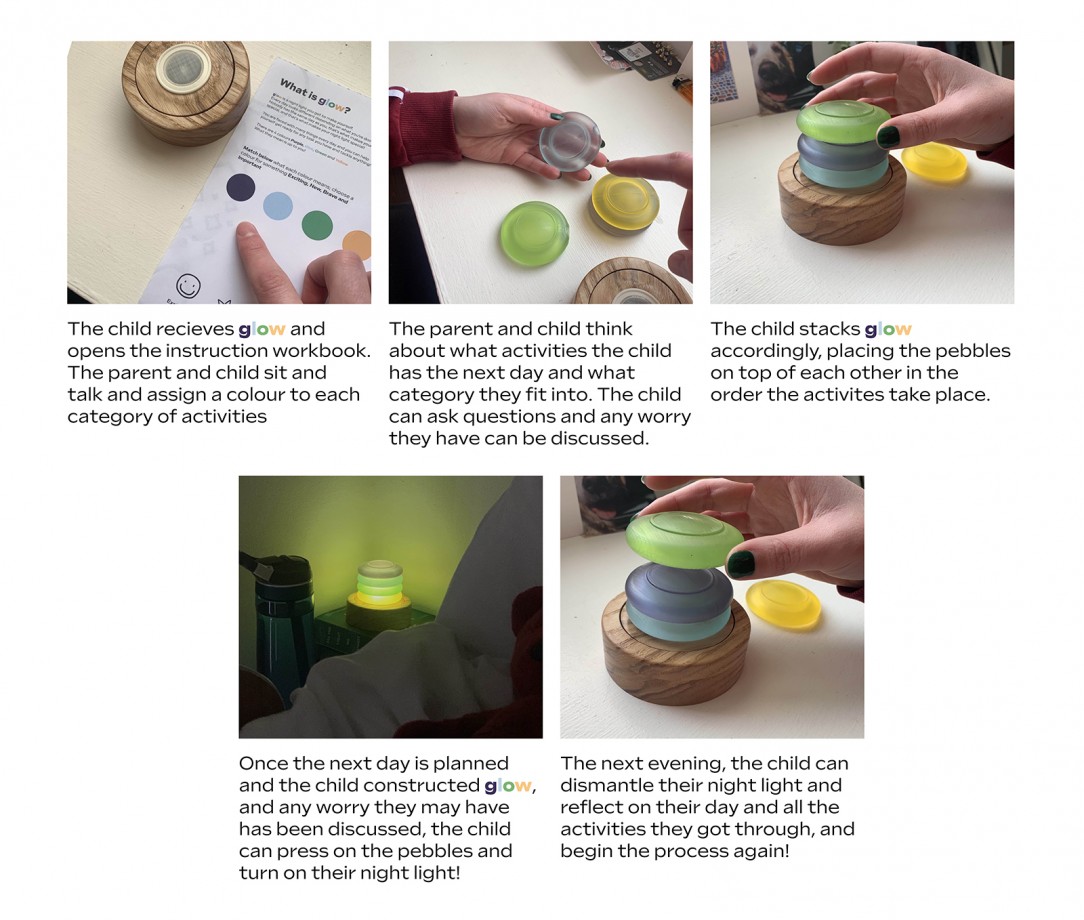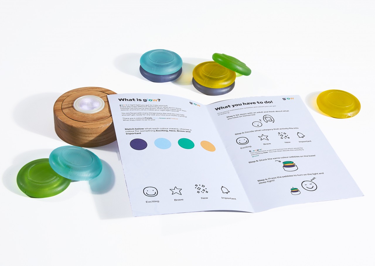 Glow is a nightlight for children aged 4-7. The child and parent will construct Glow the previous night based on what activities they have the next day. There is four different colored pebbles and four different activity categories.