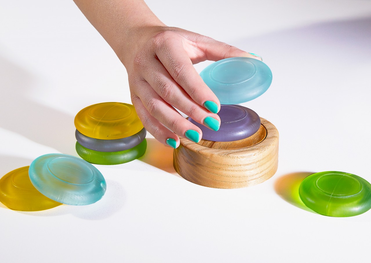 Once the pebbles are all stacked on the base, the child can press down on them which will turn on a light in the base of the nightlight and glow through each of the colors. The child will be provided with 8 pebbles, two of each color.