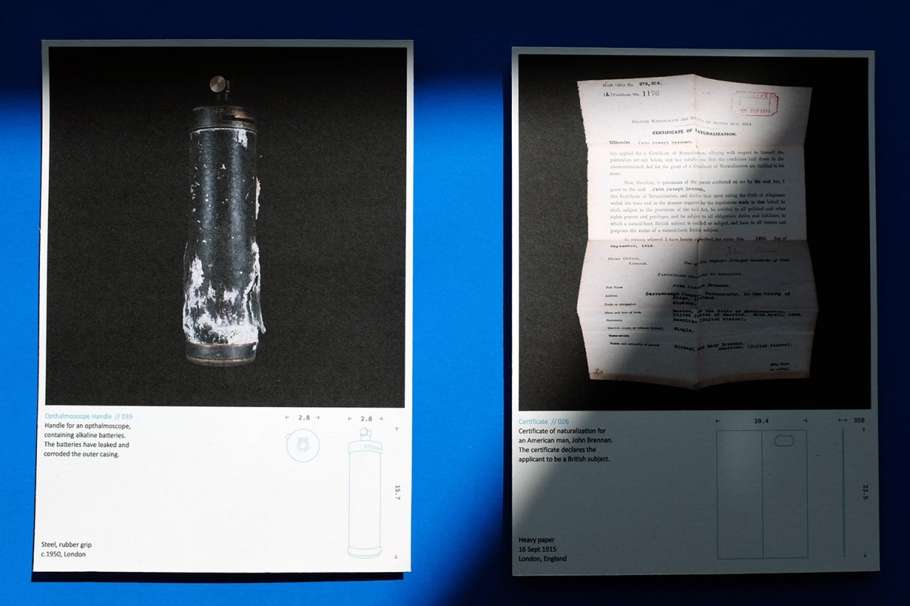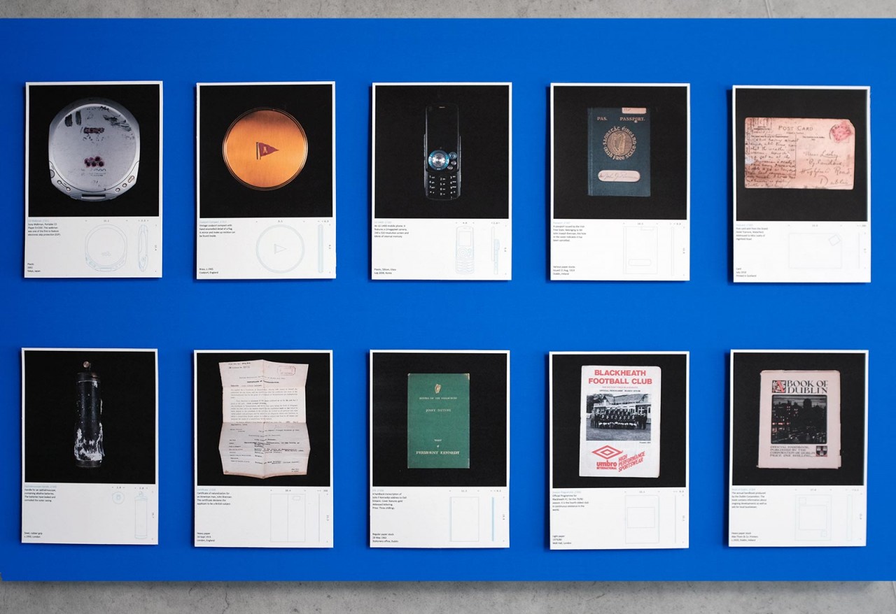 Designed as an interactive exhibition, the project comprises both physical and digital outputs. The curated objects have been thoroughly documented considering size, material, age, and origin with the information being represented on individual fact cards. Each card in the archive represents an object a person chose to collect. Some are historically significant while others are simply vessels for memories and past experience. All represent a choice to hold on to something and a belief that the object had value beyond its practical use. Some of the fact cards are displayed on shelving while the rest are gathered in an archival box where they can be examined.