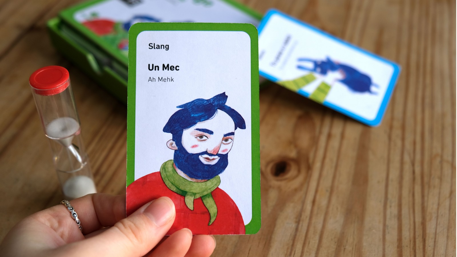 Designed to be played either solo or with multiple players, the idea is simple. The cards are double-sided. Playing green side up means you’ll be translating from the foreign language back to your own. Blue side up is vice-versa. The aim of the game is to collect as many cards as possible by successfully translating the phrase before the minute sand-timer runs out. Idiom cards come with a literal and figurative translation, so the player knows exactly what’s happening. Every phrase has a phonetic pronunciation guide (green side up), so players won’t get stuck.