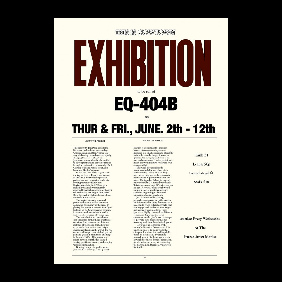 This project attempts to remind people of the cattle market that once dominated the identity of the area. By placing this project in the new East Quad building on the Grangegorman campus, it contrasts with the old cattle market that ceased operations fifty years ago.