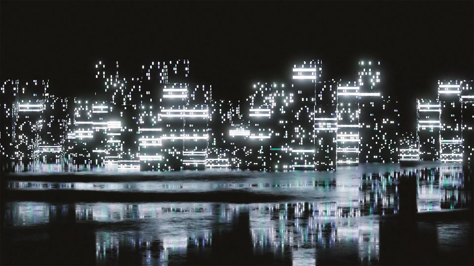 The video mostly focuses on progression. It starts with a very simple pattern on a large scale pixel grid, the pixels get gradually smaller and smaller and movements from zoom to pan and division in channels also get introduced into the visual language. In the end, it changes from the retro 4:3 aspect ratio to the modern cinematic 16:9, as well as the introduction of 3-dimensional elements in the form of an ever-changing city coloured in blue representing safety and calm. The jump from retro to present day is representative of the jump from present to future, however, it is impossible to visualise something that no one knows what it looks like.