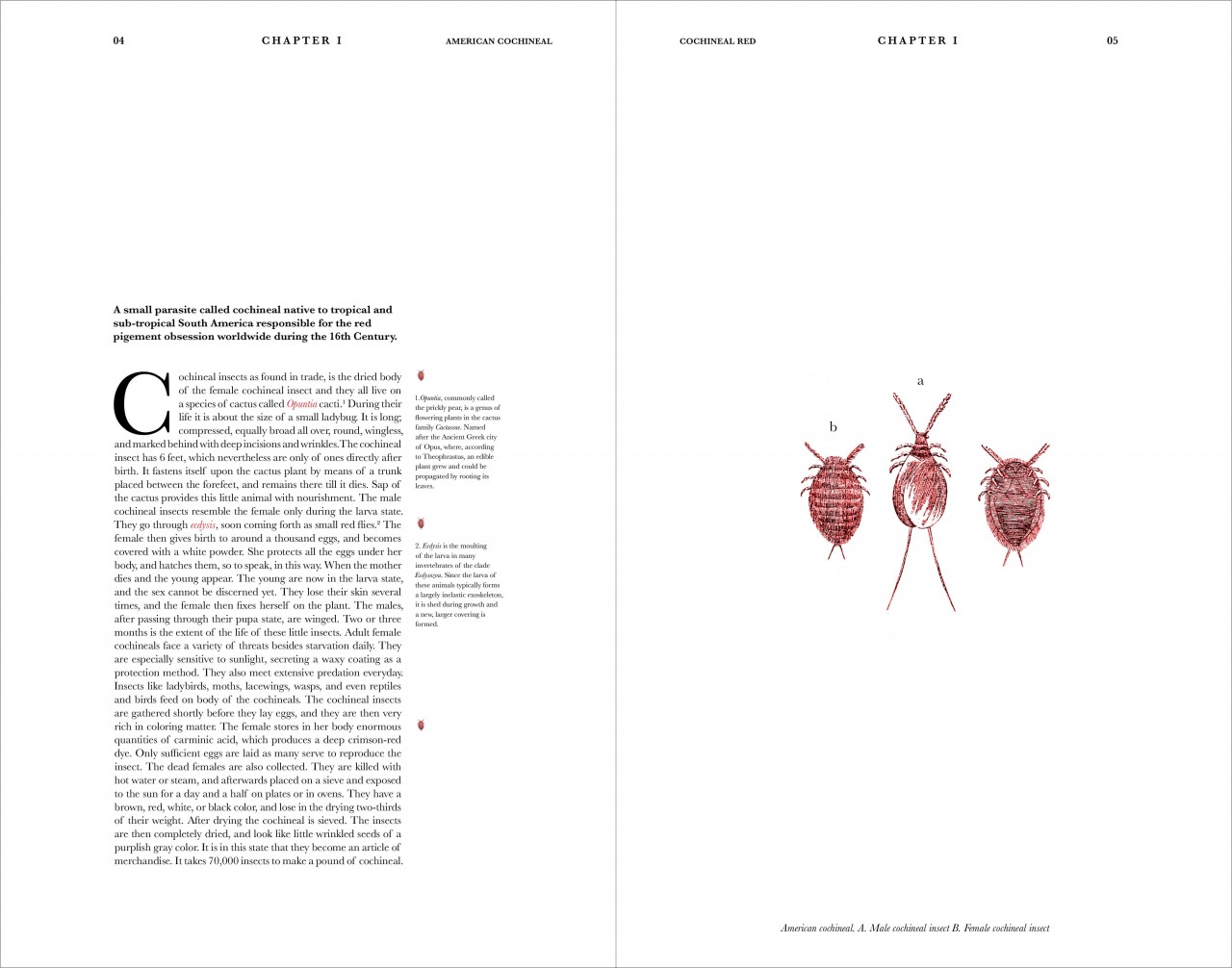 This project is a small publication in response to the colourful story brief set by ISTD. The book aims to educate artists and those alike about cochineal insects and its historical significance throughout the world specifically in Europe and South America. Cultivating cochineal dates back to 300 BCE and is still used primarily as a dye today. The publication will guide you along the journey of a cochineal insect's life all the way up to it being created into a red dye used by the Nazca tribes in Peru to many different industries in the contemporary world. Although cochineal is small their impact on the world was massive and changed the way we use red pigments forever.