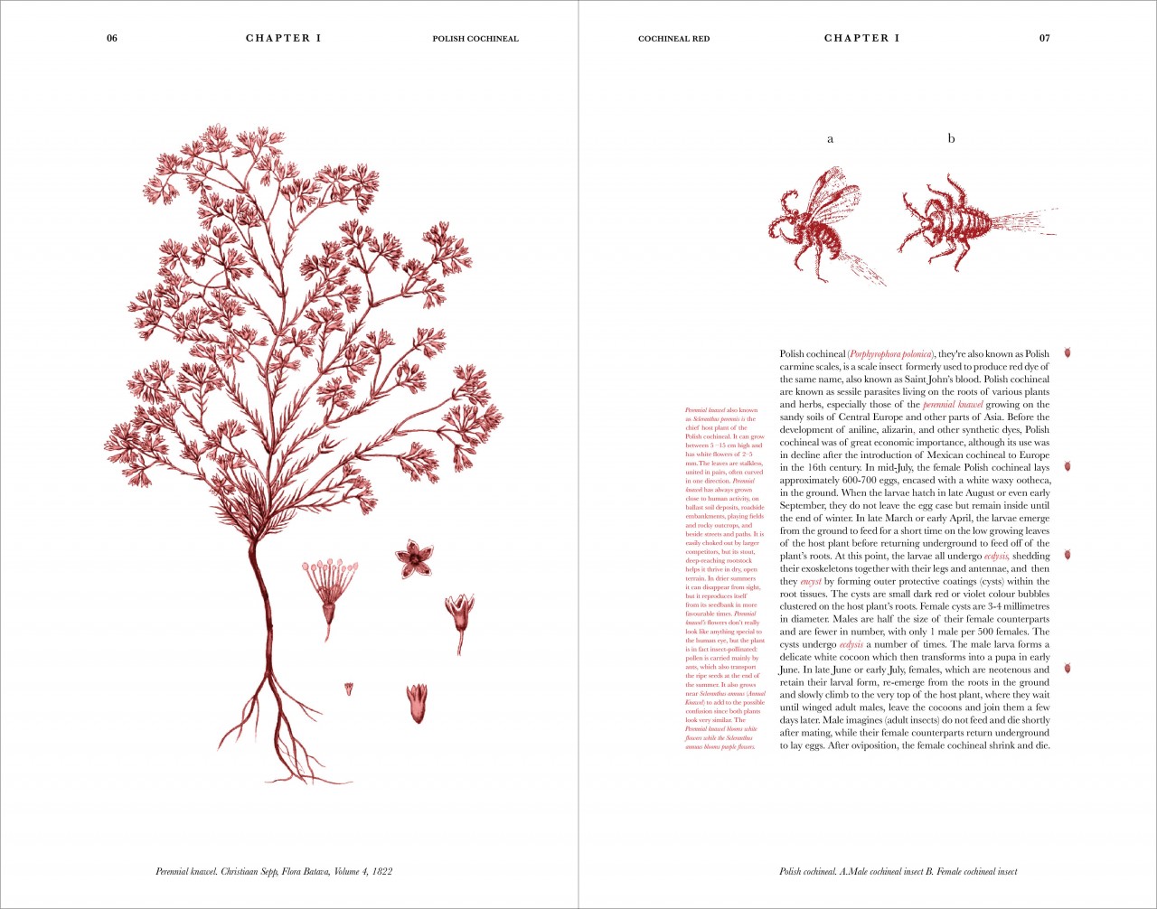 The publication is a Super Octavo size and draws inspiration from illuminated manuscripts from around the 16th century when the colonisation period began, and when cochineal began to be exported to the New World. Scattered are reimagined illustrations with a contemporary twist inspired by old encyclopaedias and illuminated manuscripts creating a playful and intriguing publication. Try and spot the small, illustrated cochineal insects on the pages!