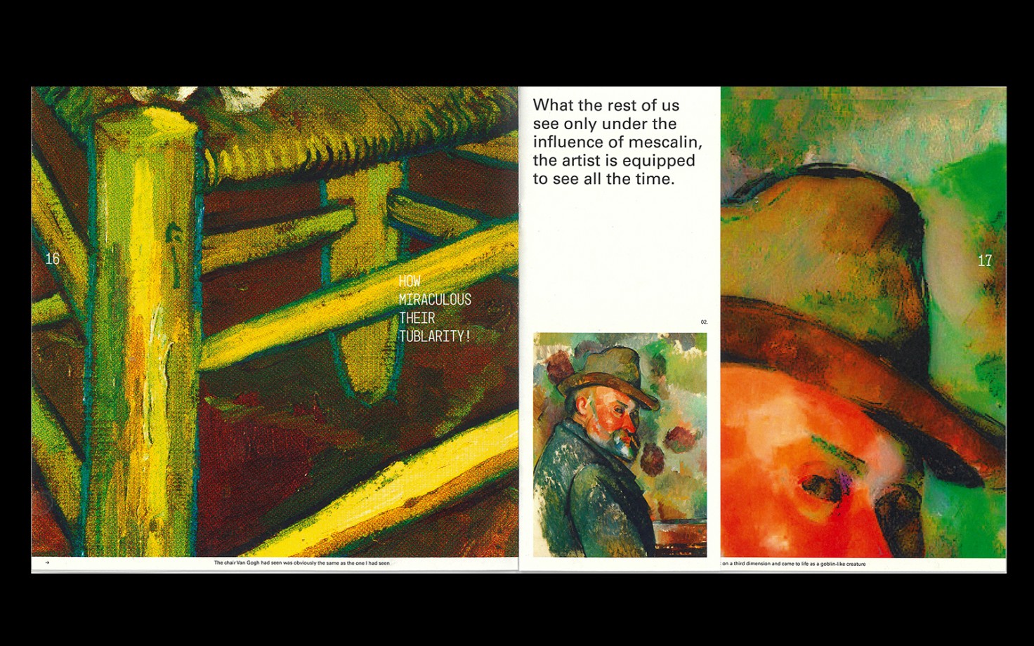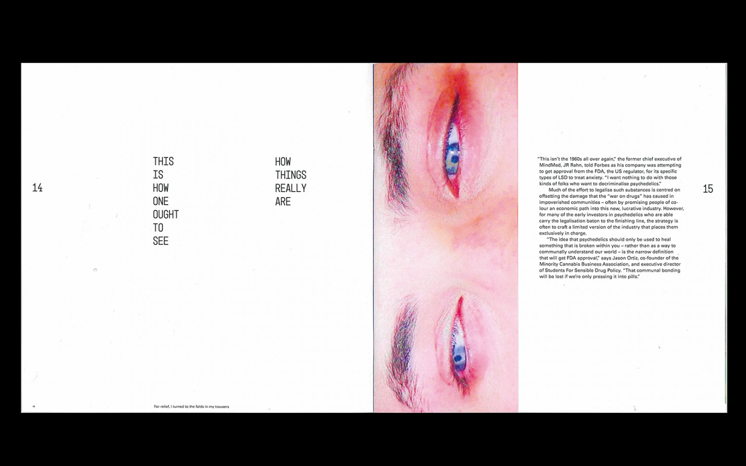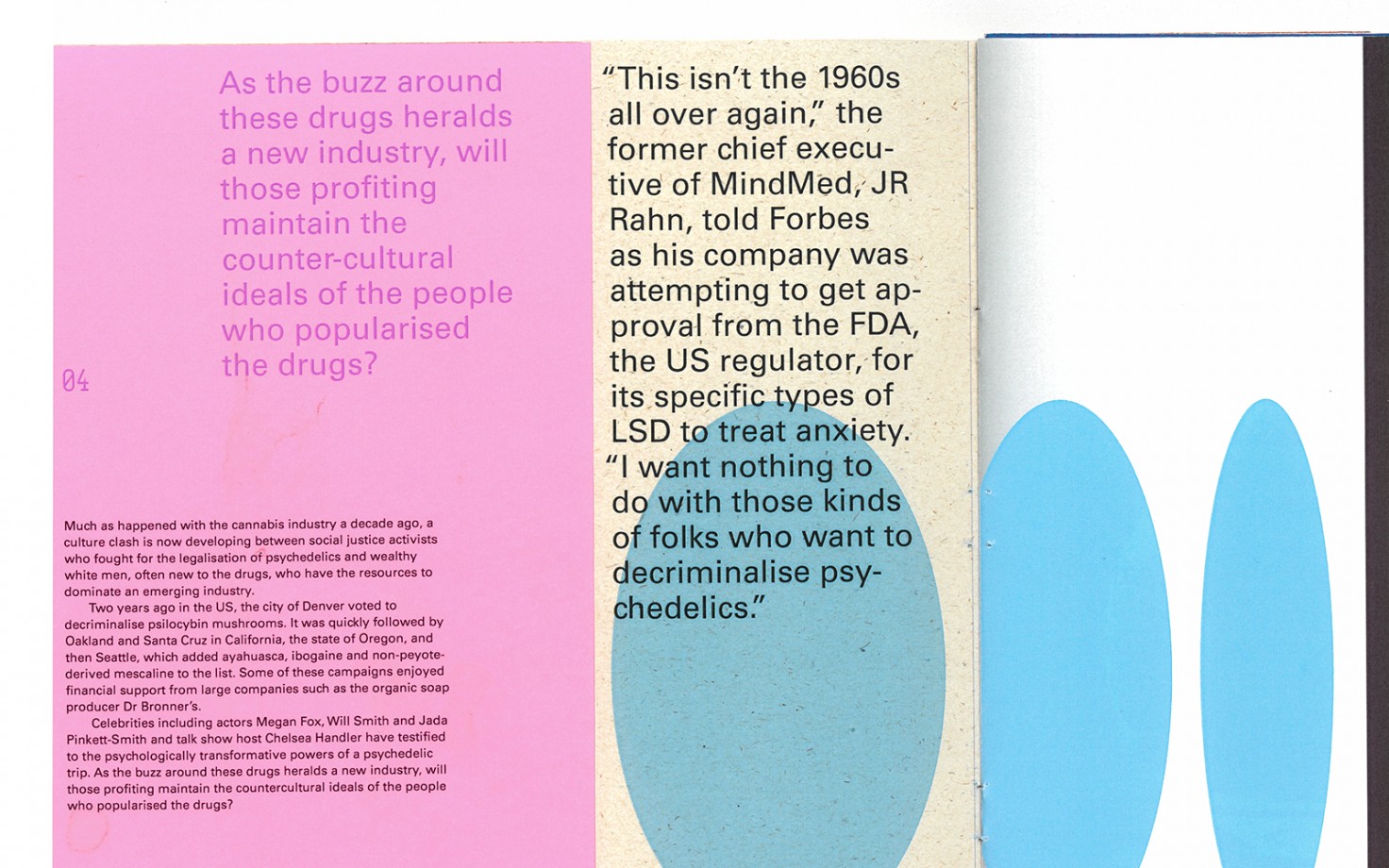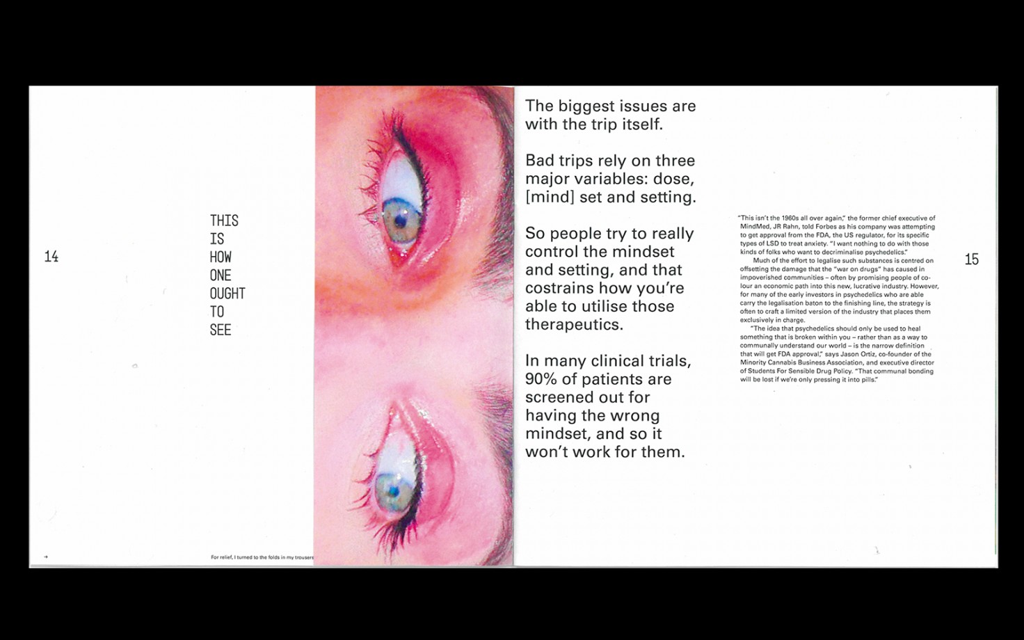 My publication explores the psychedelic culture clash happening now between big pharma and those who first made the push to decriminalise psychedelics from the 1960s onwards. Through Huxley’s experience on mescaline, the book explores different viewpoints toward the effects and uses for psychedelics in the 21st century. The typographic treatments and image-making in the book are directly influenced by Huxley’s visual experiences on the drug, with the goal of using Huxley’s vivid descriptions to present both sides of this psychedelic culture-clash.