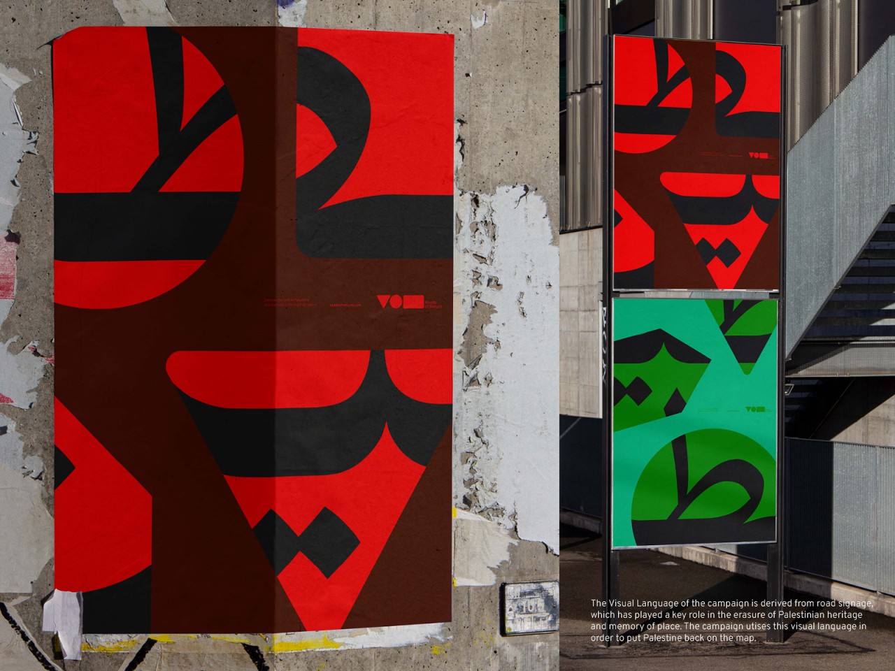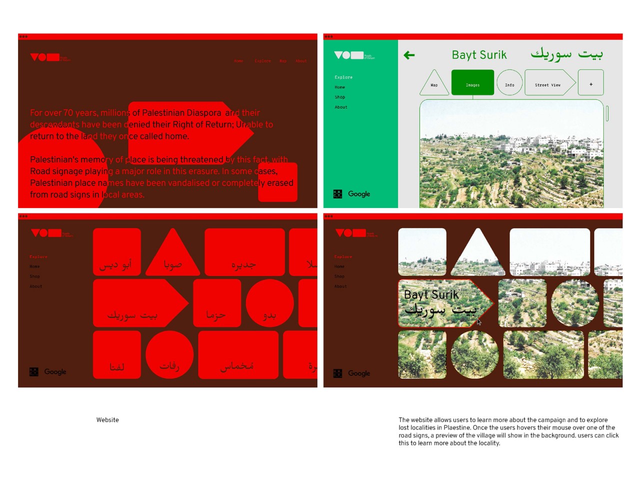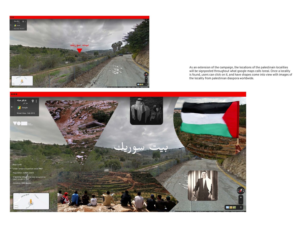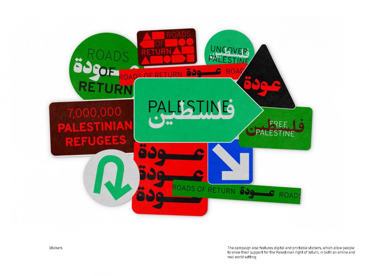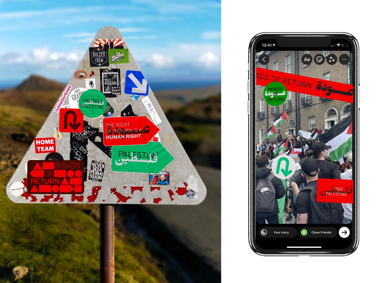 My campaign utilises the visual language of road signage and calls for action to be taken to enable Palestinian Refugees to exercise their Right of Return, while also aiding them in preserving their memories of Palestine.
