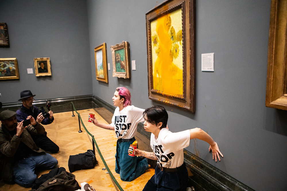 Image: Just Stop Oil Protesters Phoebe Plummer, 21, and Anna Holland, 20, splattered Heinz Tomato Soup on "Sunflowers" by Vincent van Gogh and then glued themselves to the wall below it in protest against in-action on climate change as part of a series of protests throughout the UK by the environmental group. Antonio Zazueta Olmos, www.antonioolmos.com