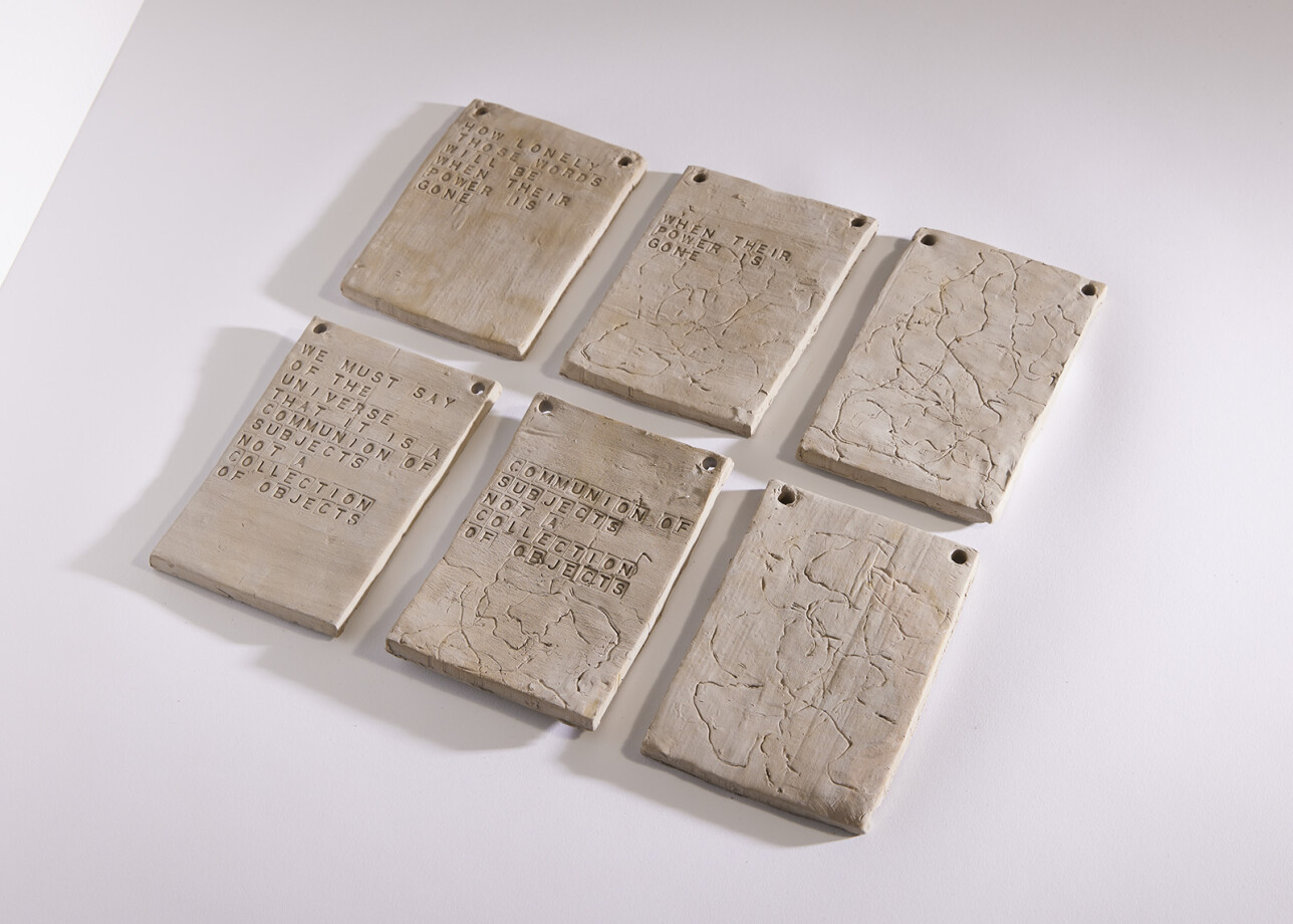This installation incorporates elements of written text in the hanging clay tiles entitled communion of subjects. Robin Wall Kimmerer's text ‘Learning the grammar of animacy’ has been a reference point for this work. Kimmerer describes how languages through time are losing their value whilst also exploring how language impacts the perceived animacy of nature.