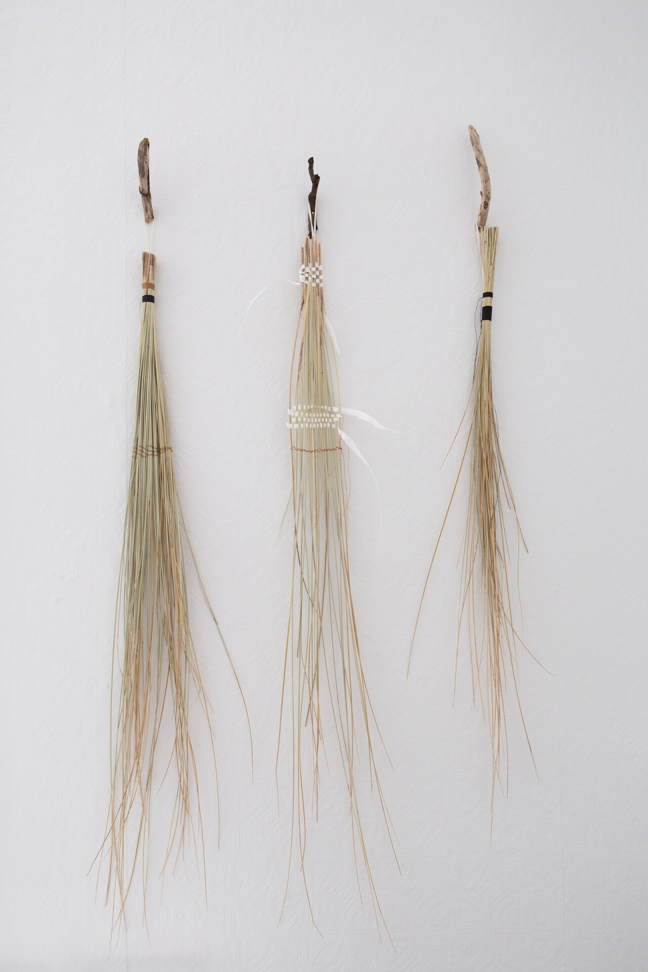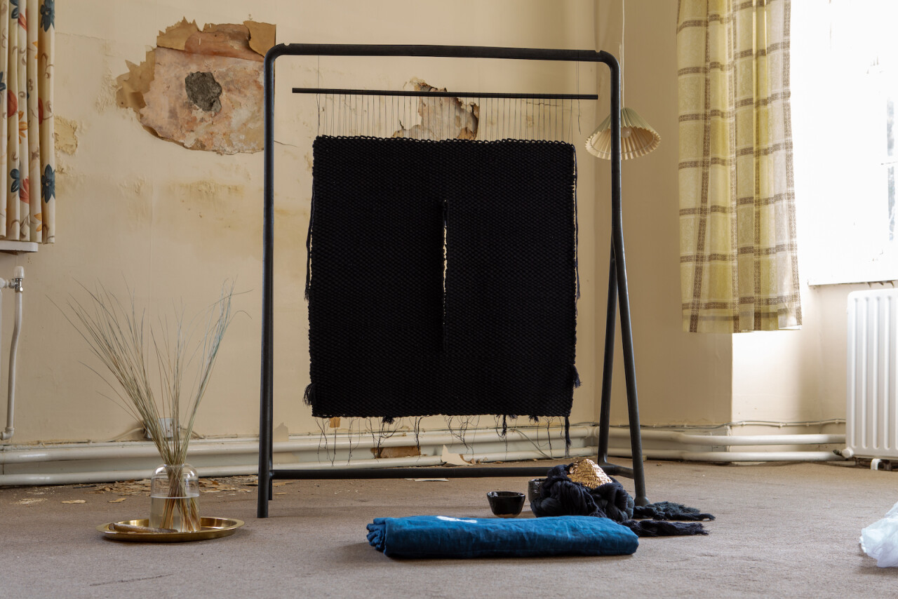Themes of transcendence, repetition and otherworldliness are present in this work. The installation engages a series of large woven threshold forms and object assemblages. Cushions invite us to pause, to be protected and held, reflecting strength within their softness. Ceramic vessels serve as containers, empty or with offering, as ritual serves as a container for grief. Stones, shells and organic materials are made sacred in service of the ritualised environment.