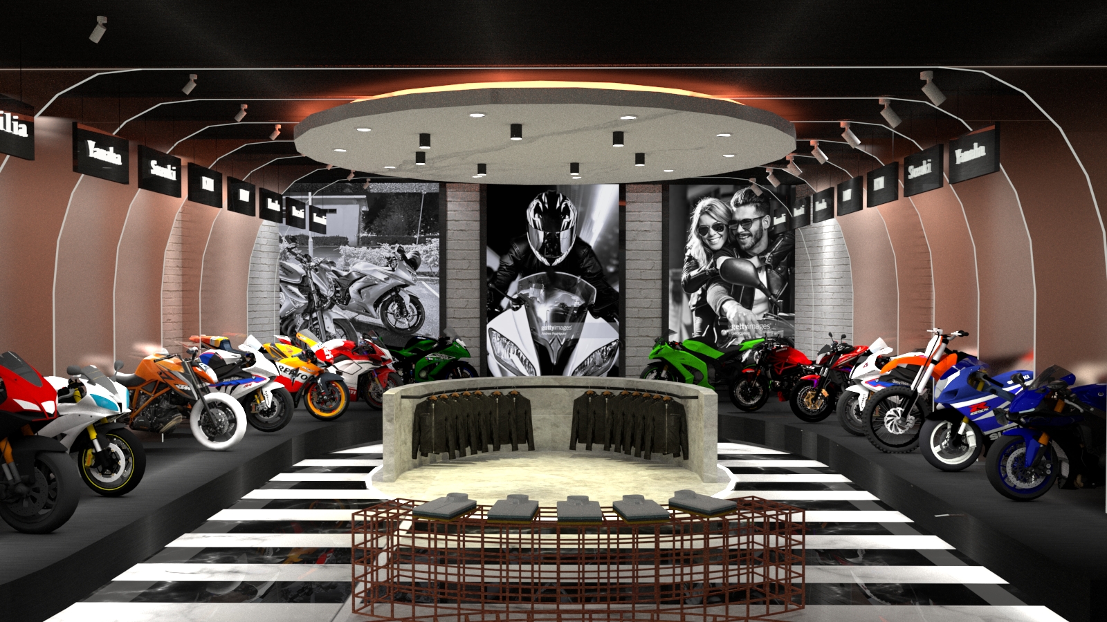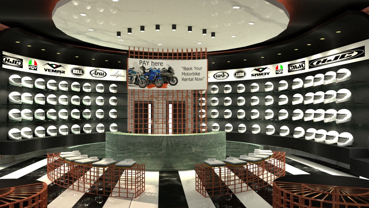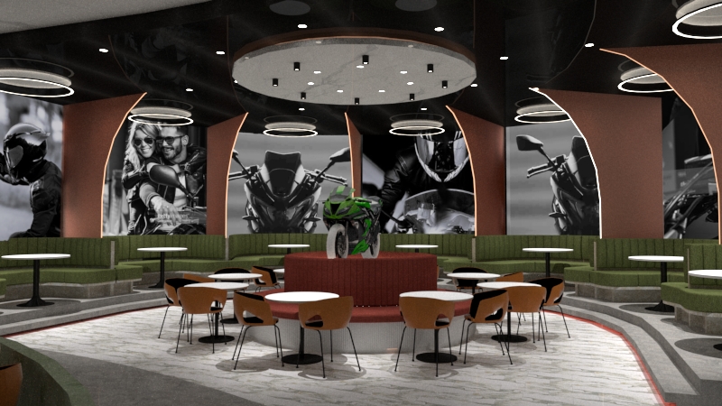 The concept of the project was taken from a gearwheel from a motorbike. The round gearwheel with ridged edges introduced curves and circular shapes into the design. The modern sports motorbike shopping experience can bring the customers into a space full of bright colours and modern LED lights.